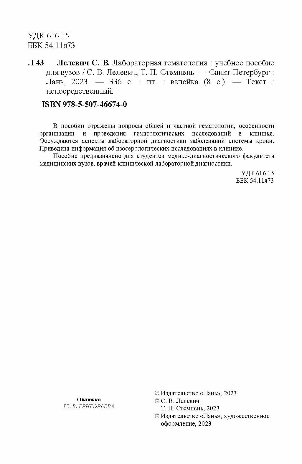 Лабораторная гематология. Учебное пособие для вузов (Лелевич Сергей Владимирович, Стемпень Татьяна Петровна); Лань, 2023