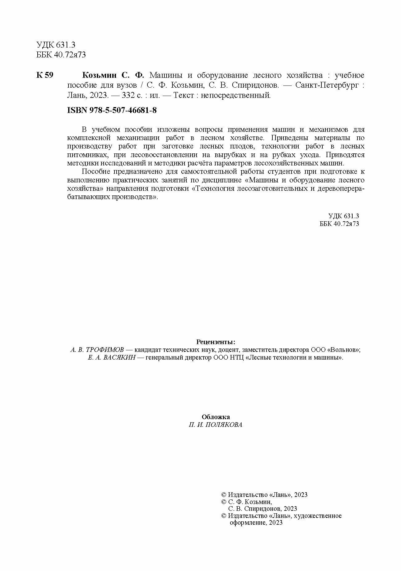 Машины и оборудование лесного хозяйства. Учебное пособие для вузов (Козьмин Сергей Федорович, Спиридонов Сергей Васильевич); Лань, 2023