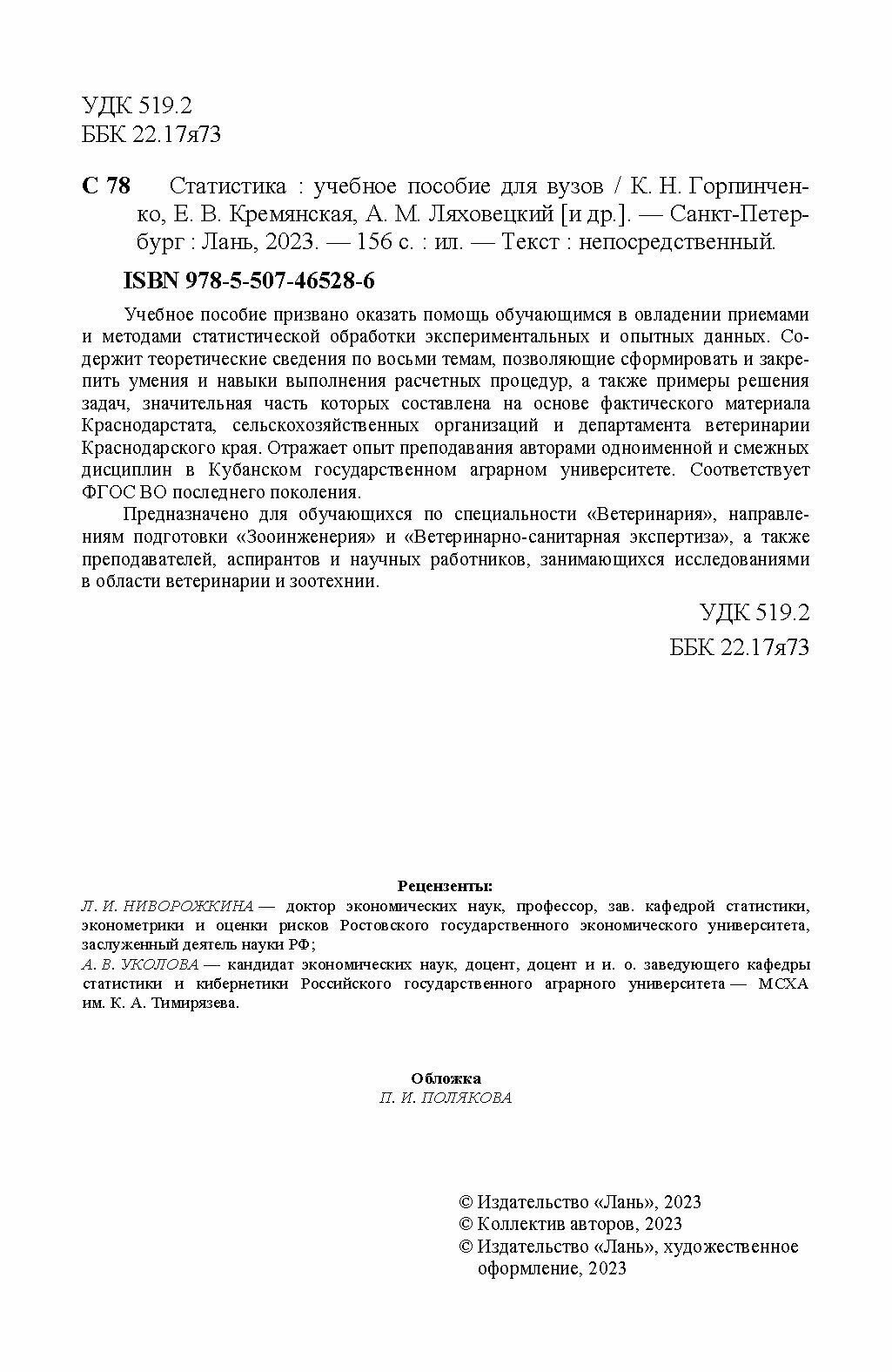 Статистика. Учебное пособие для вузов (Ляховецкий Алексей Михайлович, Кремянская Елена Вдладимировна, Горпинченко Ксения Николаевна); Лань, 2023