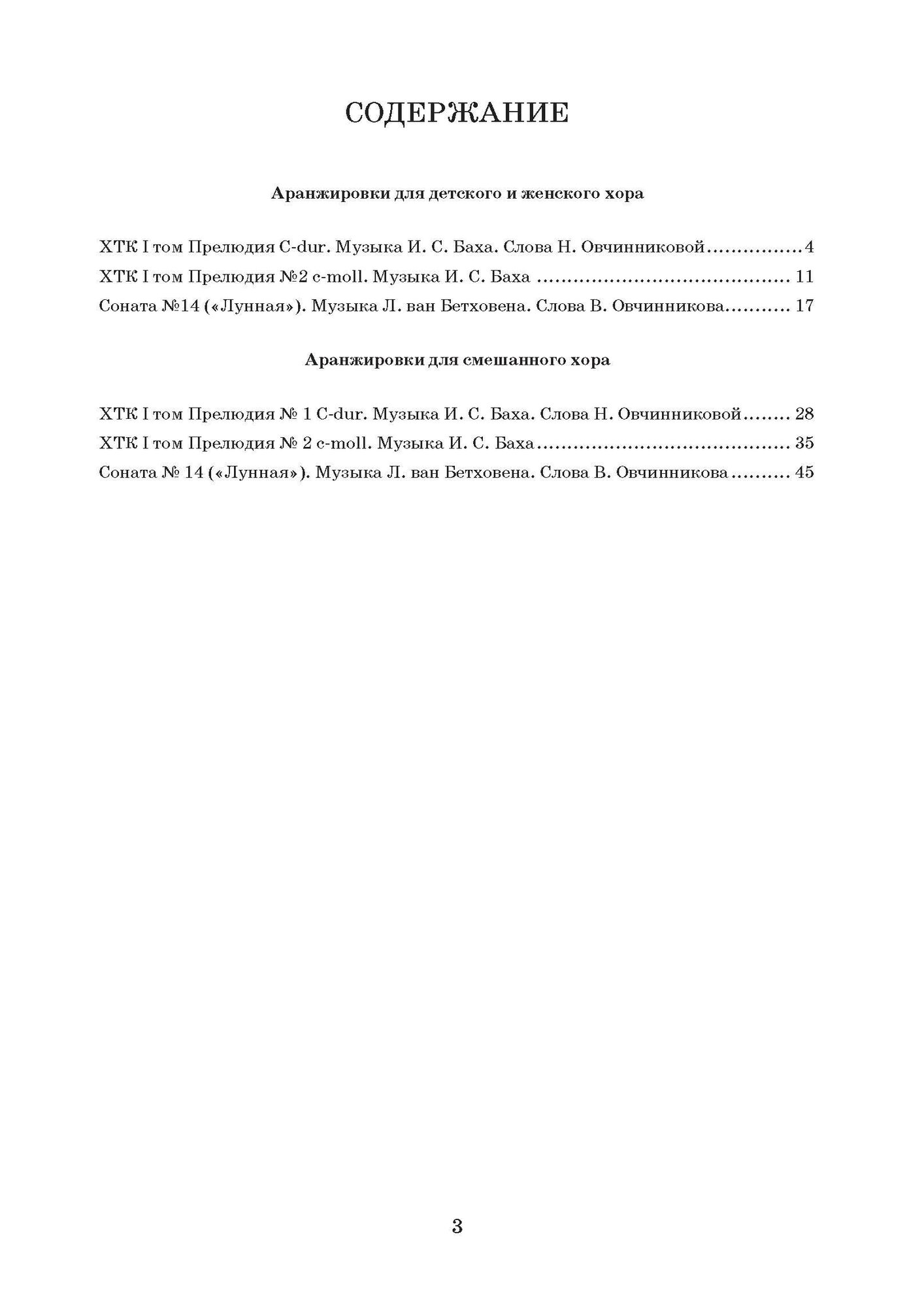 Предлагаемый сборник хоровых произведений для детского, женского и смешанного хора включает в себя аранжировки фортепианных произведений Иоганна Себастьяна Баха и Людвига ван Бетховена, выполненные Н. Овчинниковой для разных составов хора: три произведения для детского и женского составов хора (возможно исполнение хором мальчиков) и три произведения для смешанного состава хора.
