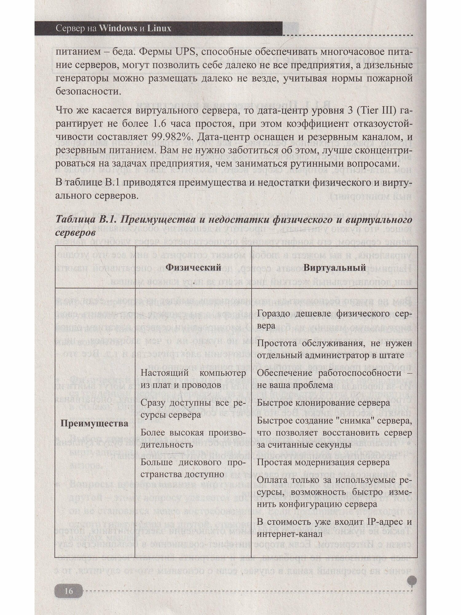 В этой книге вы сможете найти полезную информацию по администрированию и использованию серверов на Windows и Linux, причем как физических (локальных), так и виртуальных. Вы узнаете об отличиях, недостатках и преимуществах физического и виртуального сервера – вполне возможно, что это поможет вам определиться с типом сервера для своих личных задач.