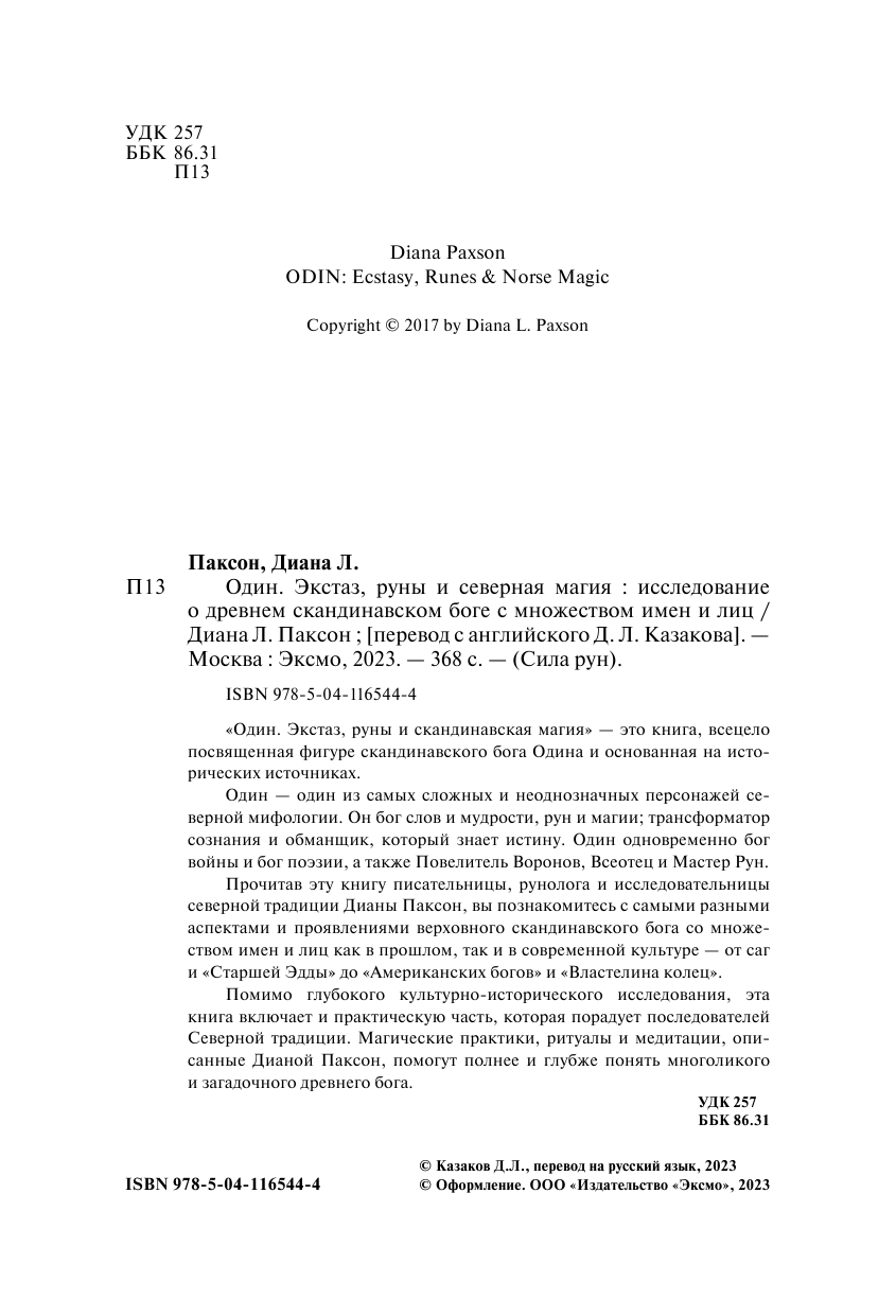 Один: экстаз руны и северная магия. Исследование о древнем скандинавском боге с множеством имен и лиц (Паксон Диана Л.); ООО "Издательство "Эксмо", 2023