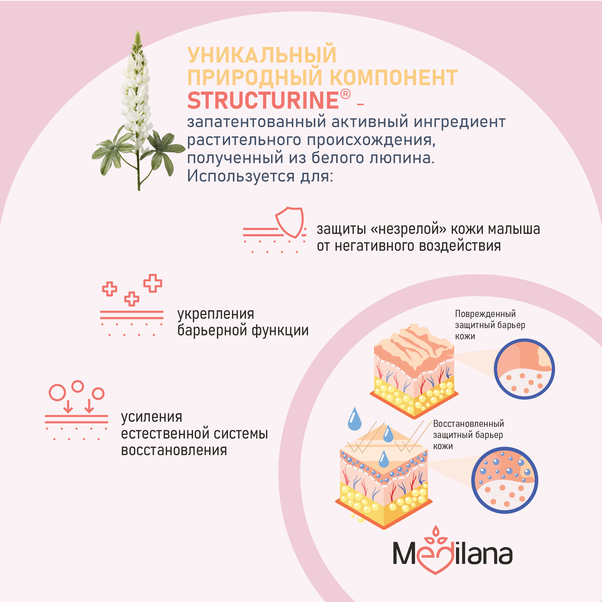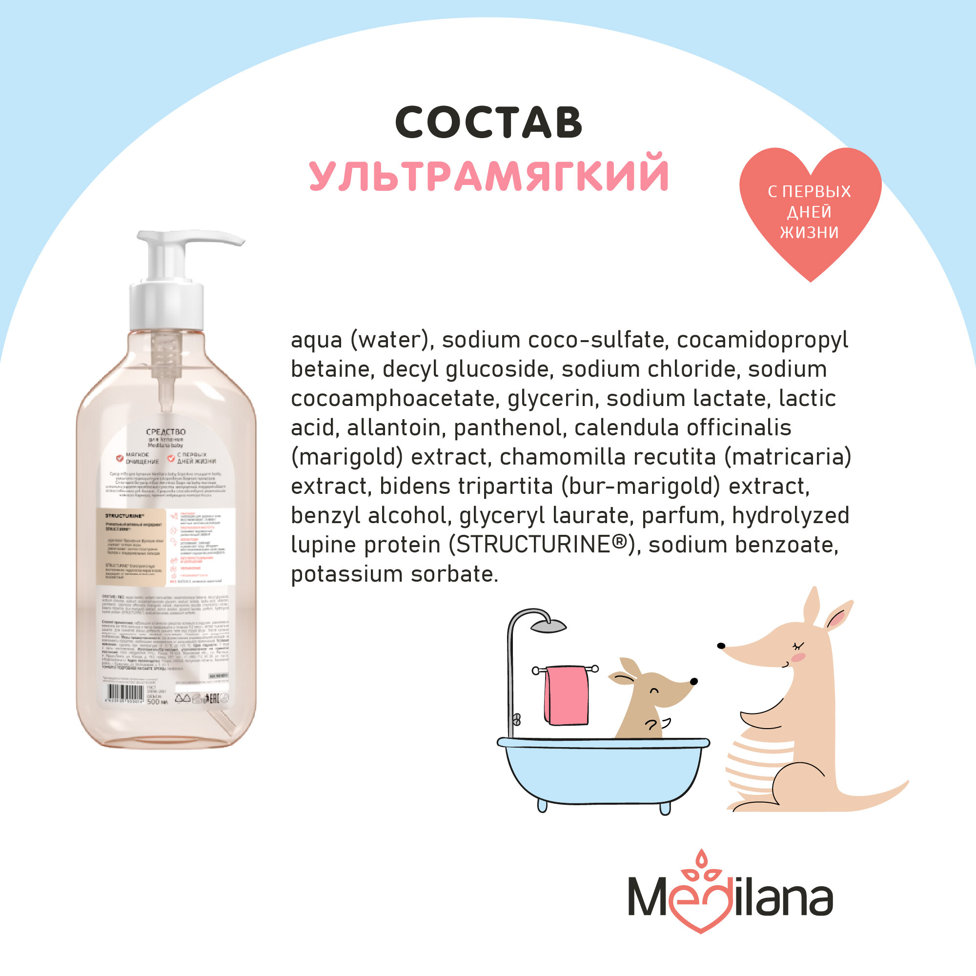 Средство для купания Medilana baby бережно очищает кожу, идеально подходит для ежедневных водных процедур. Смягчает воздействие жесткой воды на кожу малыша и минимизирует проявление сухости, шелушений, поддерживает естественный рН-баланс. Средство способствует укреплению кожного барьера, препятствующего потере влаги.АКТИВНЫЕ КОМПОНЕНТЫ:ЛАКТАНОВАЯ КИСЛОТА - оказывает выраженный увлажняющий эффект;АЛЛАНТОИН - снимает ощущение сухости и дискомфорта;ПАНТЕНОЛ - способствует восстановлению кожи, уменьшает покраснения и шелушения;ЭКСТРАКТ КАЛЕНДУЛЫ - оказывает противовоспалительное действие, нормализует водный и жировой баланс кожи.В составе есть уникальный запатентованный активный ингредиент растительного происхождения STRUCTURINE®, полученный из белого люпина. STRUCTURINE®:- усиливает естественную систему восстановления кожи;- дополнительно защищает "незрелую" кожу малыша от негативного внешнего воздействия- укрепляет барьерную функцию кожи. Medilana учитывает особенности строения кожи ребенка с момента рождения и в течение первых лет жизни, сочетая в рецептурах инновационный подход и абсолютную безопасность средств. Уход в первую очередь должен быть направлен на защиту от негативного воздействия окружающей среды в период адаптации новорожденного к новым условиям жизни. Косметика Medilana поддерживает мам в ежедневном уходе за детской кожей, даря спокойствие и уверенность в качестве.Способ применения: Небольшое количество средства вспеньте в ладонях, равномерно нанесите на тело малыша и легко помассируйте в течение 1-2 минут, затем тщательно смойте. Для принятия ванны добавьте немного геля под струю воды. После купания аккуратно промокните кожу малыша полотенцем. Подходит для ежедневного применения