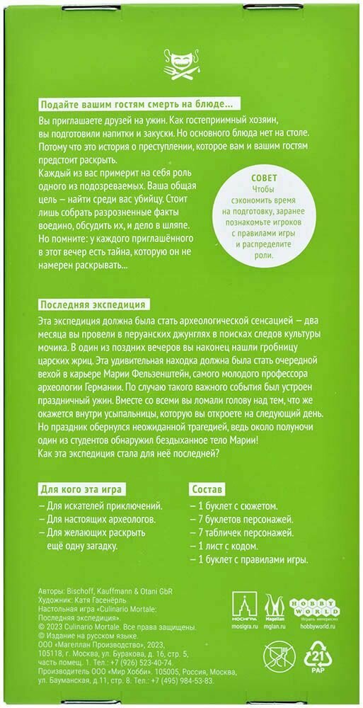 Как играть?Перед игрой каждый получит буклет с информацией для своего персонажа и изучит его, никому не раскрывая содержимое. После, за столом, все будут выяснять, кто же убийца, общаясь друг с другом по прописанным в буклете правилам. Лишь один из игроков причастен к преступлению, но это отнюдь не означает, что остальные абсолютно невинны! У каждого есть свои скелеты в шкафу: вопрос в том, на что вы пойдёте, чтобы скрыть их Игроки не имеют права обманывать друг друга, за одним исключением – преступнику вовсе не обязательно говорить правду. Задача игроков – найти убийцу, в то время как он изо всех сил будет отводить от себя подозрения. Ваше главное оружие – собственные дедуктивные и социальные навыки.