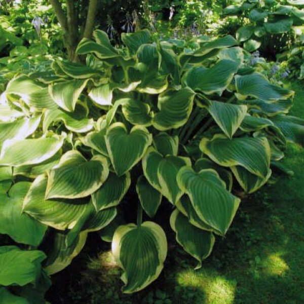 **Хоста гибридная Йеллоу Ривер** — многолетнее растение, которое меняет окраску в течение сезона. Предпочитает полутень или легкую тень. Полив проводится дважды в неделю. Комфортная температура выращивания — от 10°C до 20°C. Период посадки — с августа по ноябрь. Предпочитают слегка кислые, влажные почвы.