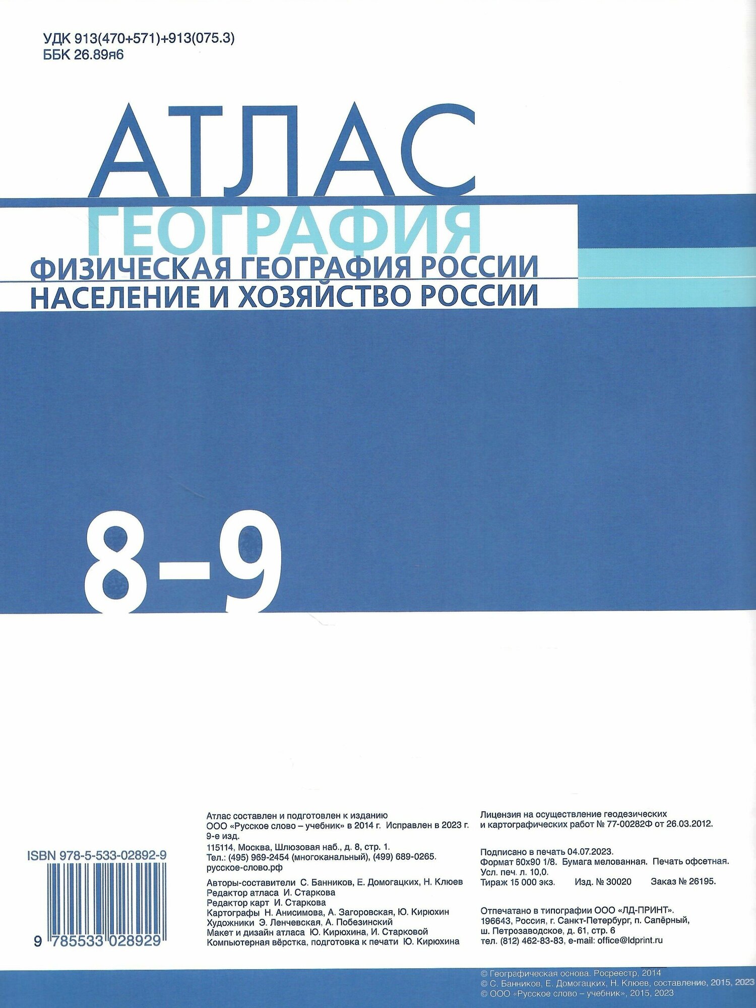 Атлас. География. Физическая география России. Население и хозяйство России. 8-9 класс (Евгений Михайлович Домогацких, Николай Николаевич Клюев, Сергей Валерьевич Банников); Русское слово, 2025