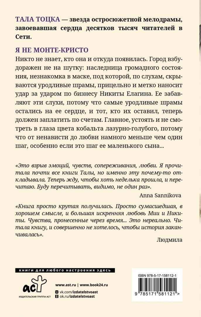 На сегодняшний день товар «Книга: Я не Монте-Кристо (Тоцка Тала); АСТ, Жанры, 2023» можно купить с кешбеком в 4 магазинах: Читай-город, book24, Яндекс.Маркет, Буквоед