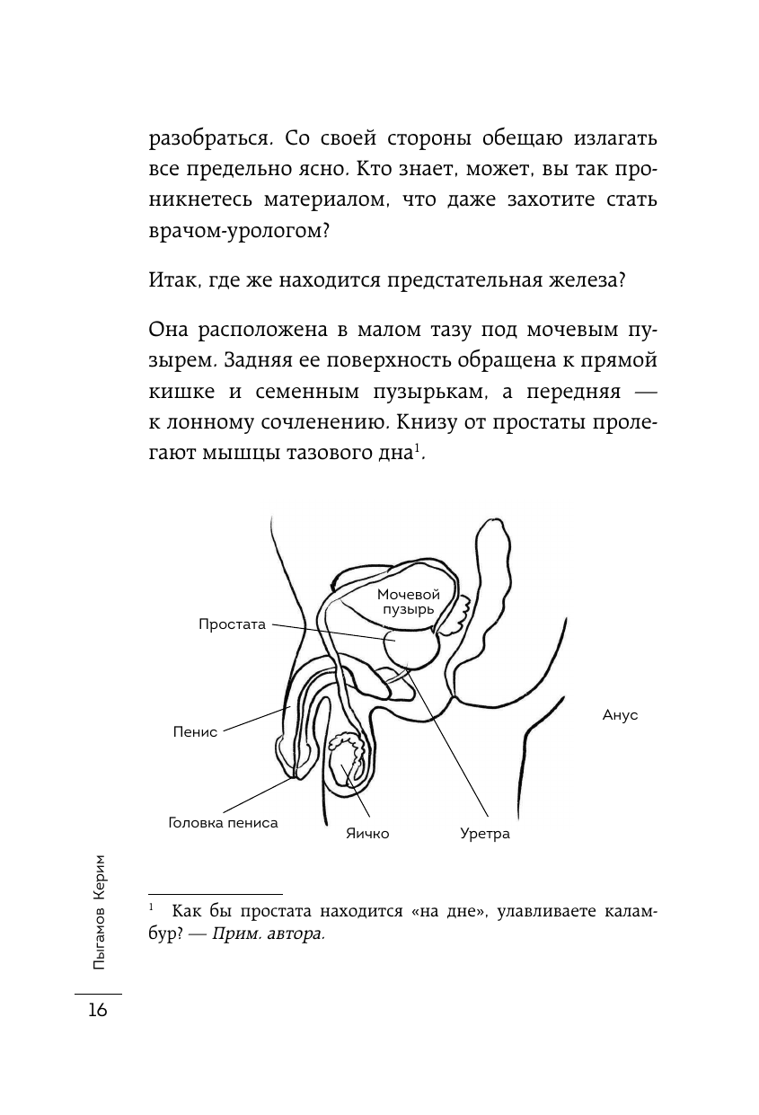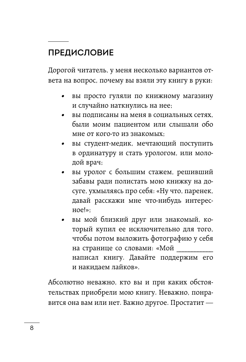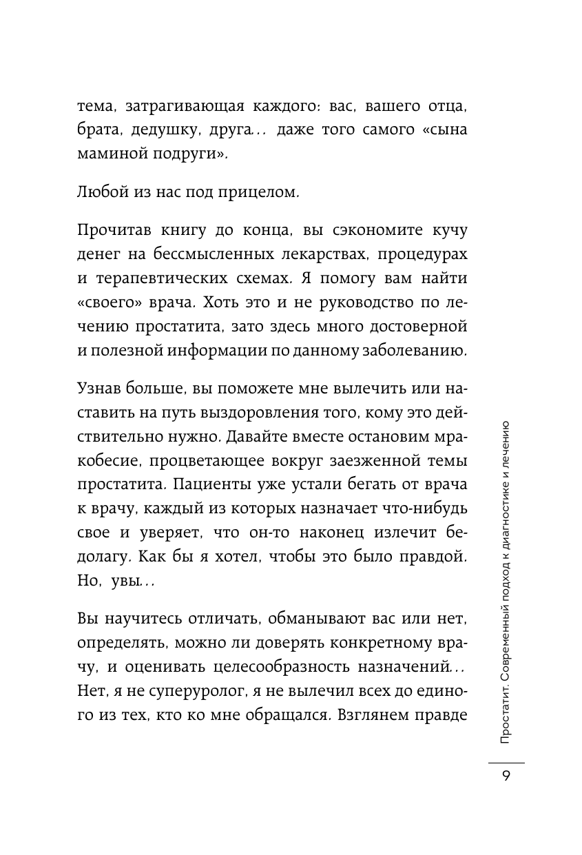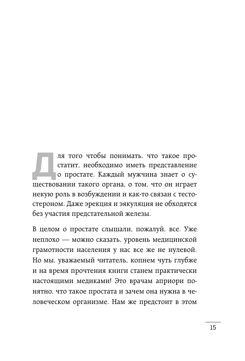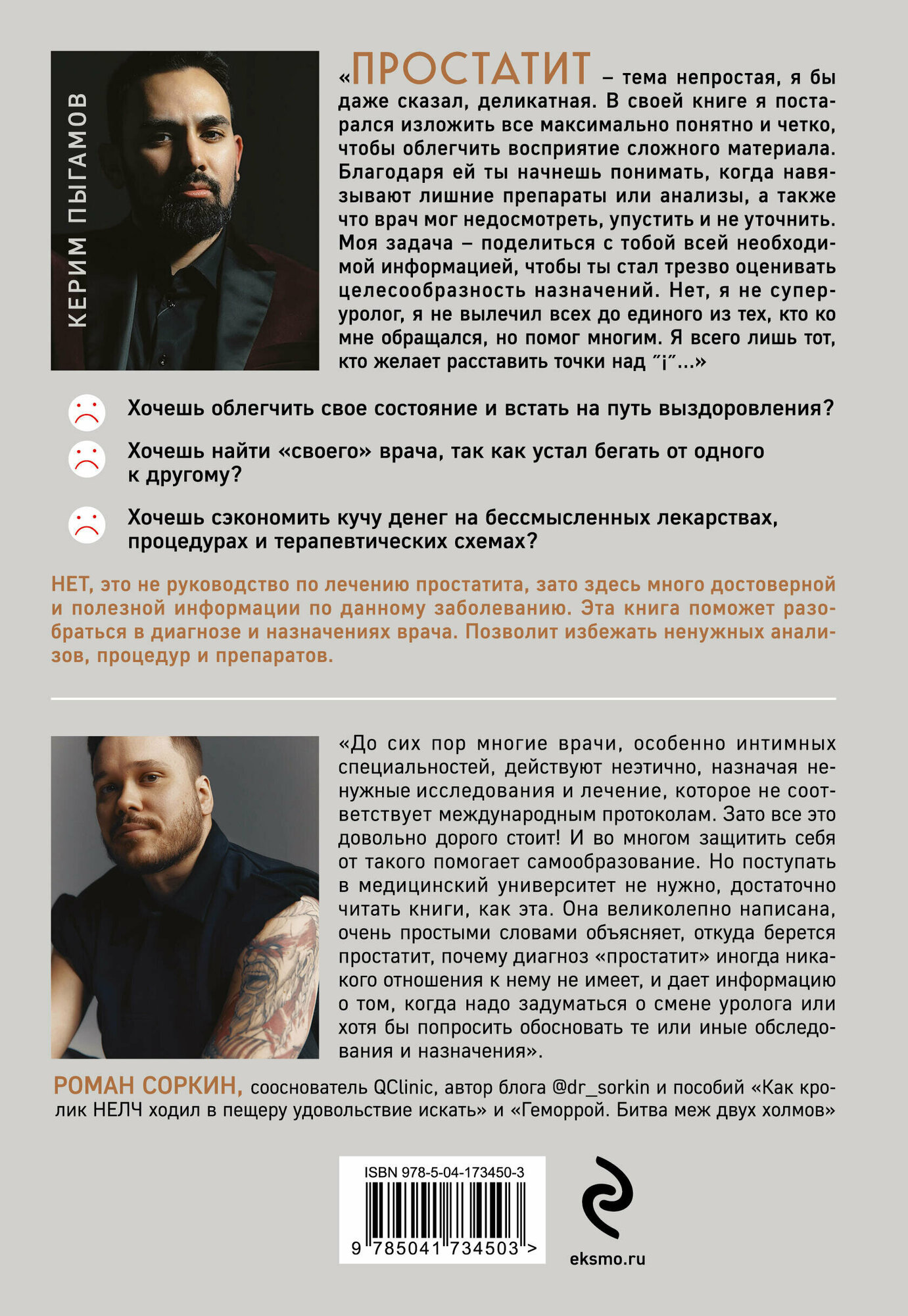 «До сих пор многие врачи, особенно интимных специальностей, действуют не этично, назначая ненужные исследования и лечение, которое не соответствует международным протоколам. Зато все это довольно дорого стоит! И во многом защитить себя от такого помогает самообразование. Но поступать в медицинский университет не нужно, достаточно читать книги, как эта. Она великолепно написана, очень простыми словами объясняет, откуда берется простатит, почему диагноз ""простатит"" иногда никакого отношения к нему не имеет и дает информацию о том, когда надо задуматься о смене уролога или хотя бы попросить обосновать те или иные обследования и назначения». — Роман Сорокин, сооснователь QClinic, автор блога @dr_sorkin и пособий «Как кролик НЕЛЧ ходил в пещеру удовольствие искать» и «Геморрой. Битва меж двух холмов».