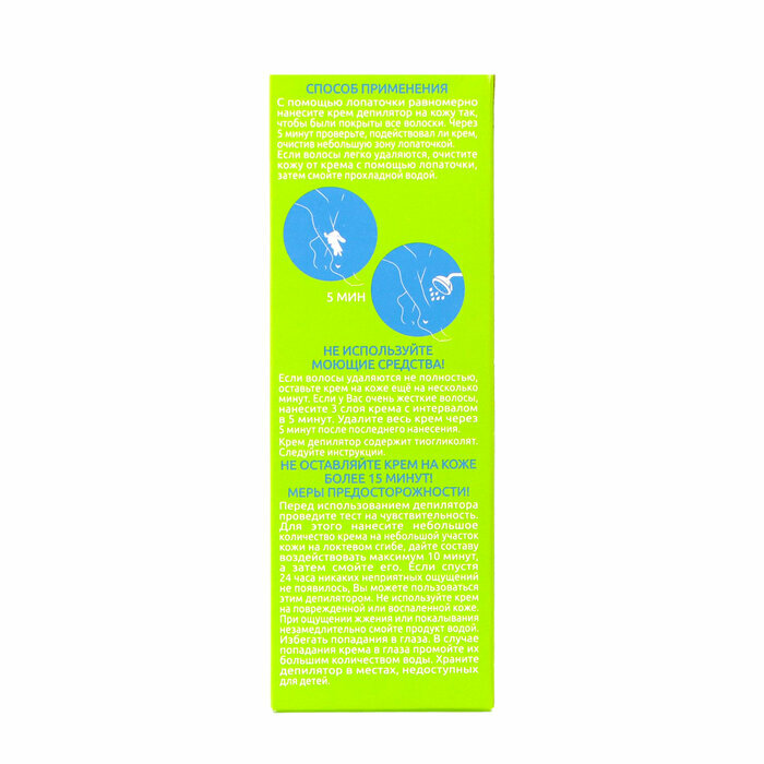 | Способ применения | С помощью лопаточки равномерно нанесите крем-депилятор на кожу так, чтобы были покрыты все волоски. Через 5 минут проверьте подействовал ли крем, очистив небольшую зону лопаточкой. Если волосы легко удаляются, очистите кожу от крема с помощью лопаточки, затем смойте прохладной водой. Не используйте моющие средства! Если волосы удаляются не полностью, оставьте крем на коже еще на несколько минут. Если у Вас очень жесткие волосы, нанесите 3 слоя крема с интервалом в 5 минут. Удалите весь крем через 5 минут после последнего нанесения. Крем-депилятор содержит тиогликолят. Следуйте инструкции! Не оставляйте крем на коже более 15 минут. |