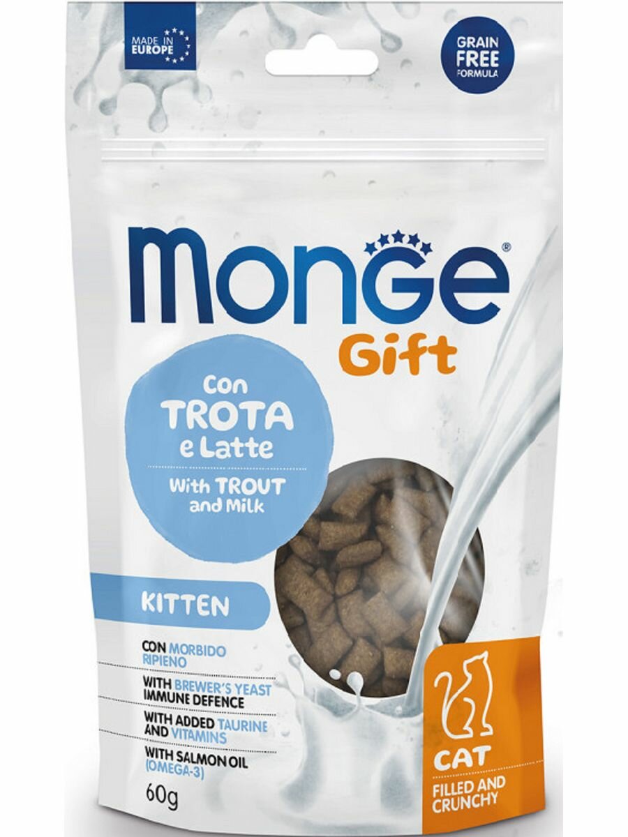 Monge Лакомство для котят Хрустящие подушечки с начинкой форель и молоко 60 гр.