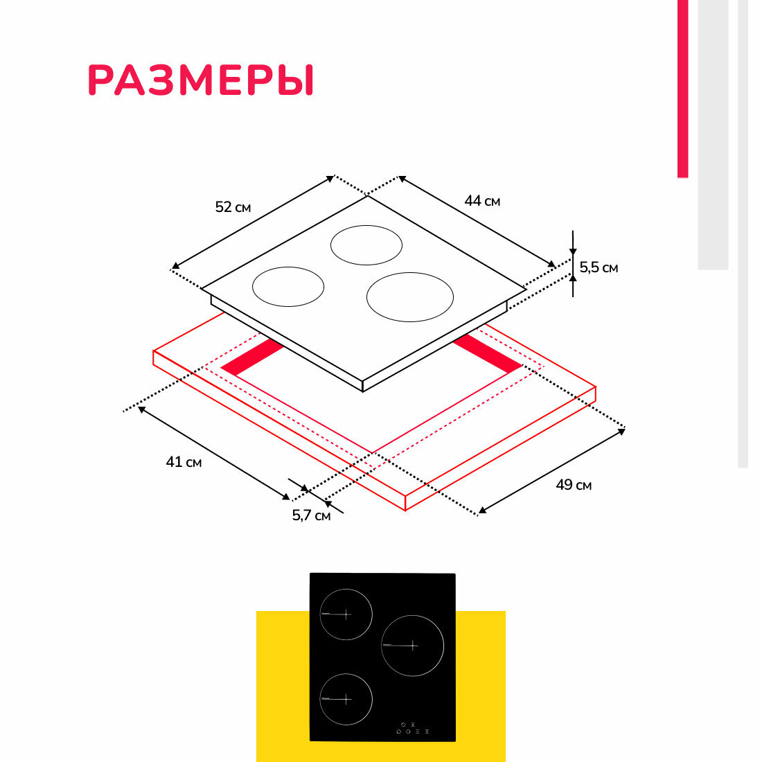 | Размер варочной панели | 5,5х45х52 |