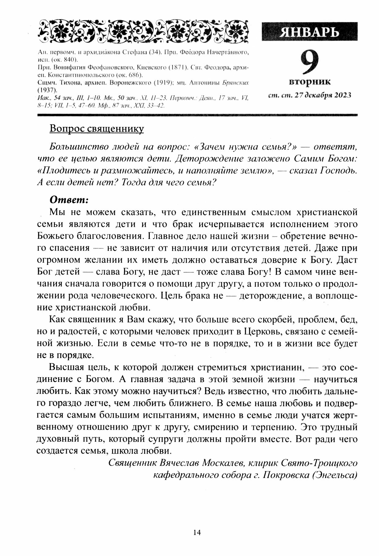 В календаре "Благодатный очаг" вы найдете глубокие по своей мудрости наставления святых отцов о воспитании детей и взаимоотношении супругов, практические советы от современных священников супругам и родителям о том, как преодолевать трудности во взаимоотношениях с детьми и друг с другом, ценные советы о сохранении здоровья и долголетия, молитвы Господу Иисусу Христу, Пресвятой Богородице и святым о благополучии, здравии и сохранении семьи и детей от напастей, бед и соблазнов мира, об умножении любви и взаимопонимания между супругами, фрагменты детских книг, рецепты постных и праздничных блюд и многое другое. Надеемся, что тексты и идеи из этого календаря послужат вам и вашим близким в течение долгих лет и помогут создать благословенный, счастливый и благодатный семейный очаг.