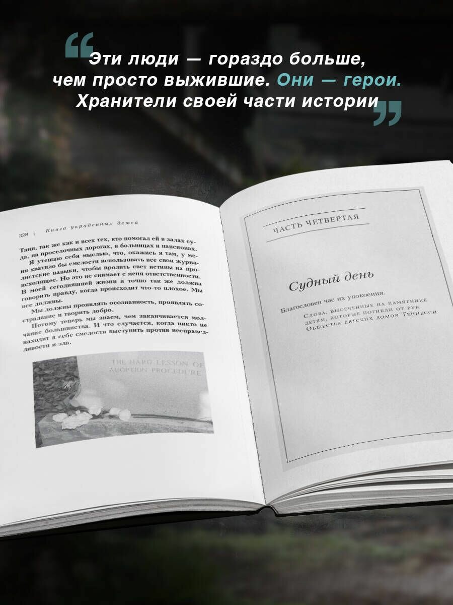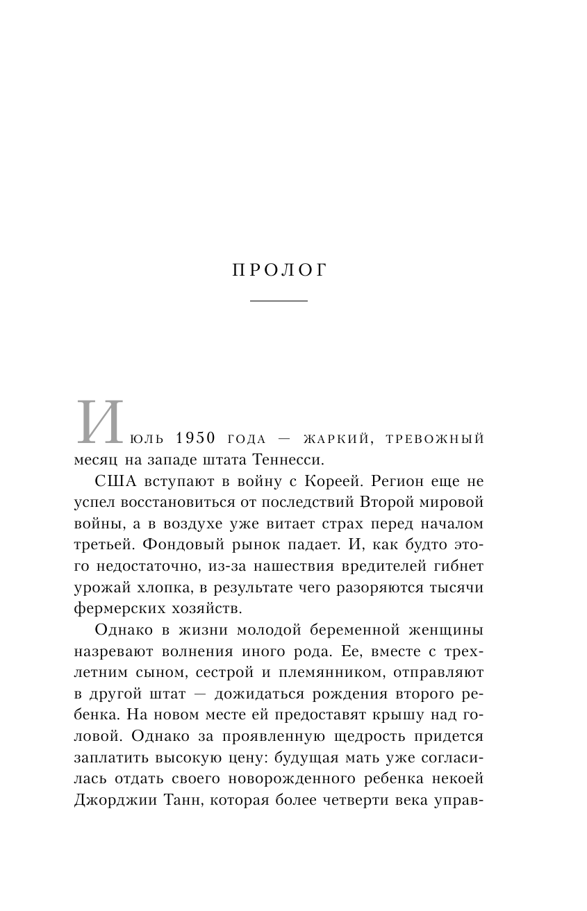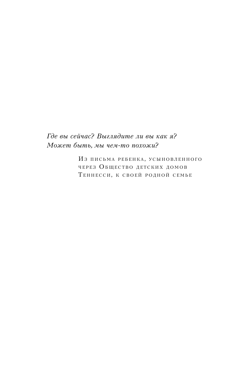 Эта книга о жертвах нашумевшего скандала с усыновлением. С 1924 по 1950 год Джорджия Танн занималась торговлей детьми в Обществе детских домов штата Теннесси. Она отдала на усыновление более 5 000 детей, объявив их сиротами, скрыв тот факт, что многие из них были украдены из бедных семей и у женщин, которым в родильном доме сказали, что их дети умерли. Пронзительный, иногда шокирующий рассказ о циничности зла, надежде и стойкости перед лицом самых жестоких обстоятельств.