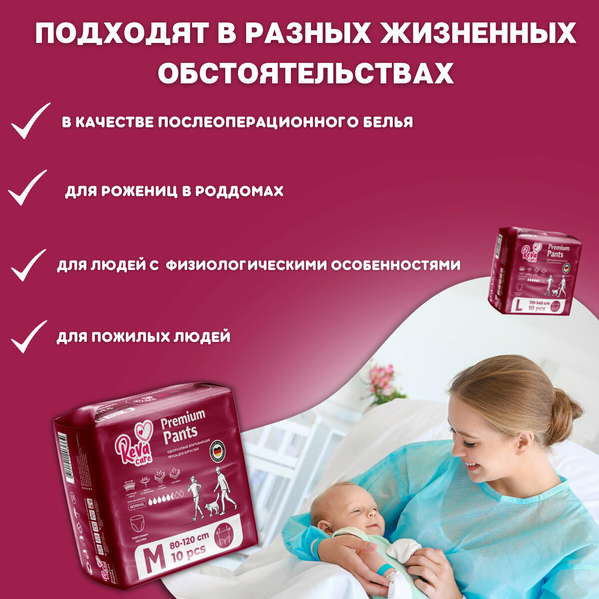 Сухость, идеальное прилегание к телу и комфорт во время движений — главные требования к подгузникам для взрослых. Именно такие характеристики подходят для описания памперсов-трусиков для взрослых Reva Care. Возможность принимать естественную анатомическую форму, мягкие фиксирующие резинки и разнообразие размеров — в этой серии вы обязательно найдете подгузники-трусики для взрослых со средней или тяжелой степенью недержания. Атрибут “специального назначения” выглядит как обычное белье и не выделяется под одеждой. Суперабсорбент подгузника для взрослых лежачих больных, пожилых людей хорошо впитывает влагу и “запирает её на замок”. Никаких протеканий и мгновенное блокирование неприятных запахов. Мягкий материал подгузников для взрослых не вызывает раздражений и не натирает кожу. Продукт дерматологически протестирован и имеет сертификат качества. Чтобы выбрать нужный размер трусов-подгузников для взрослых, достаточно измерить обхват талии.