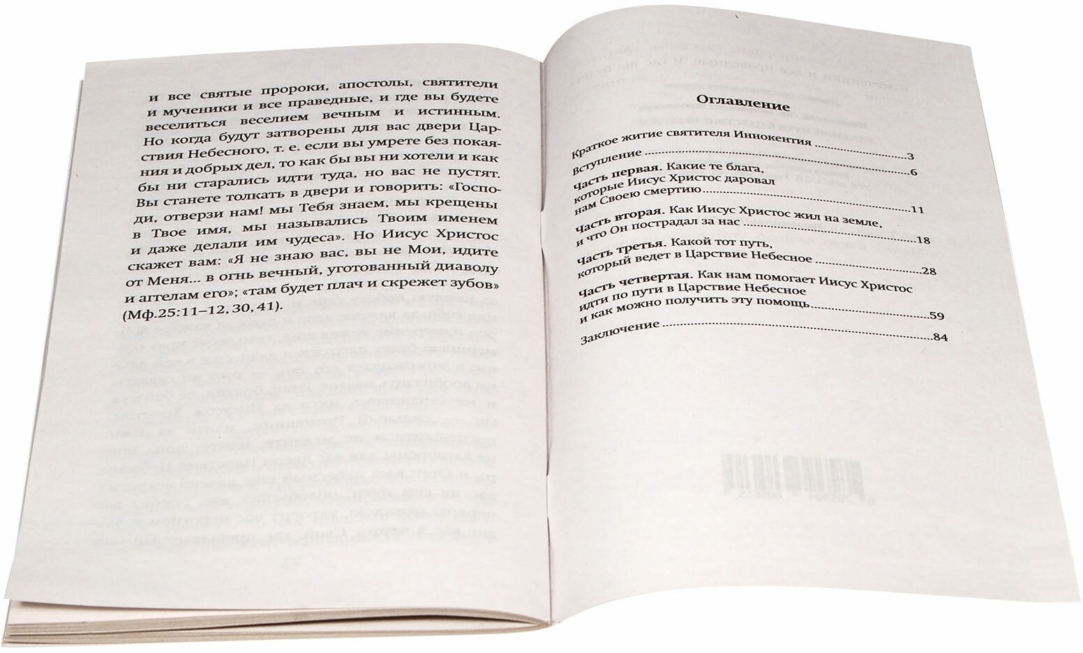 Образцом смиренномудрия и образцом речи, простой и проникнутой теплотой чистой веры, остается нам небольшая книжка митрополита Иннокентия «Указание пути в Царствие Небесное». В ней указано, как нам можно исполнить слово Спасителя — взять крест и по Нем идти, как получить Духа Святого, как уничтожить преграду грехов, которая отделяет нас от Искупителя нашего и от Царствия Небесного.
