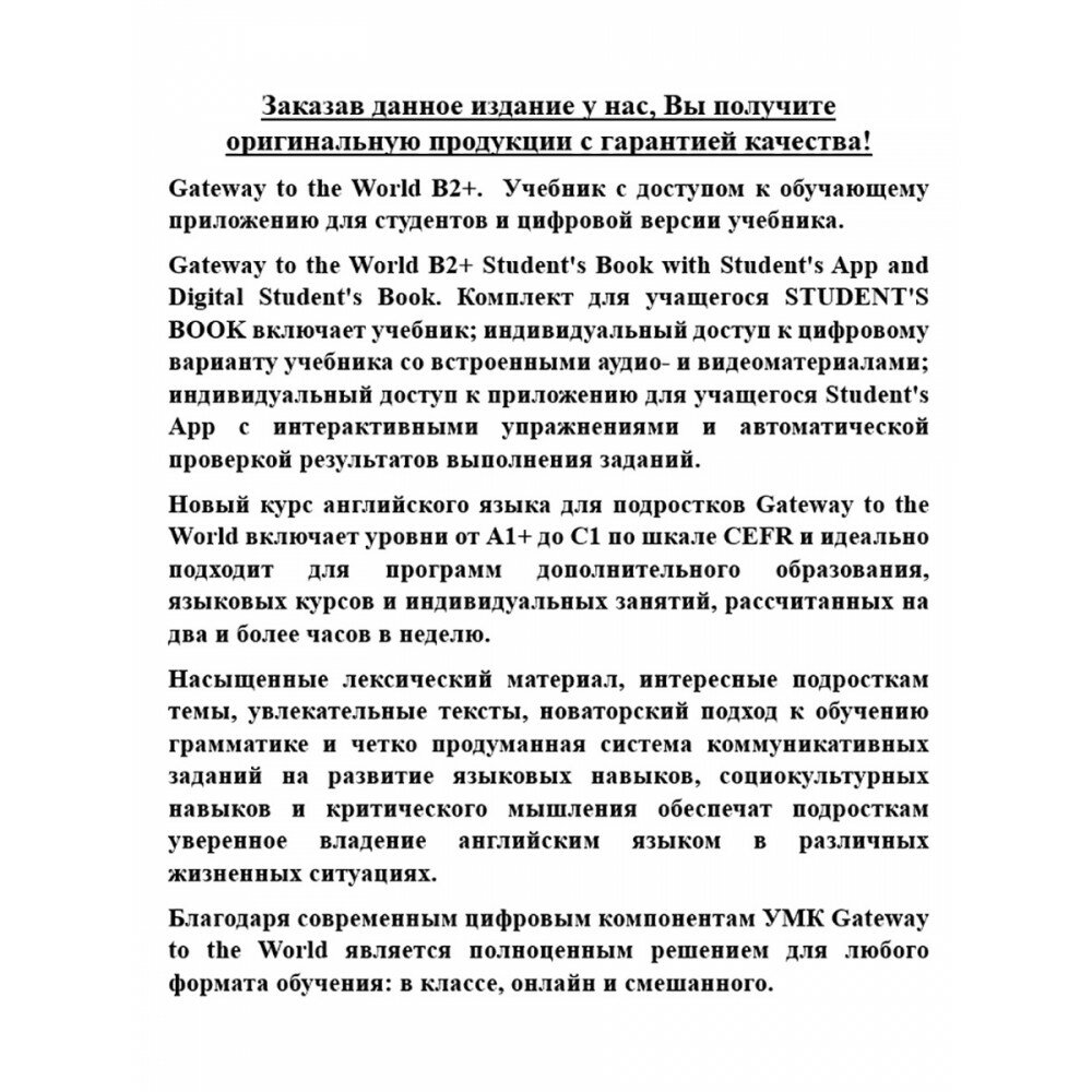 На сегодняшний день товар «Книга: Gateway to the World. B2+. Student's Book with Student's App and Digital Student's Book (Spencer David); MacMillan, 2022» можно купить с кешбеком в 1 магазине: Яндекс.Маркет