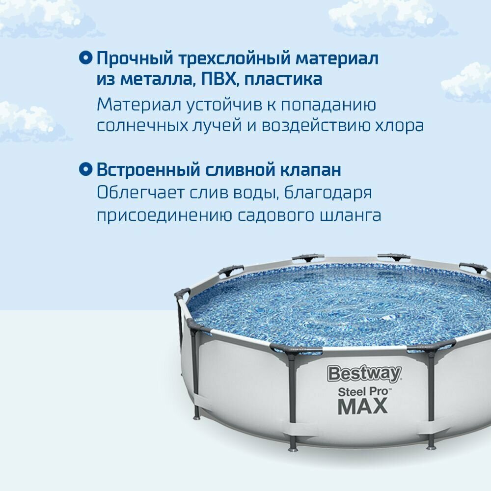Каркасный бассейн Bestway 56416 отличается высокой прочностью и устойчивостью. Чаша выполнена из высококачественного трехслойного ПВХ: два слоя плотного винила и между ними сетка из полиэстера для особой прочности. Цвет чаши бассейна снаружи светло-серый, внутренняя поверхность имеет расцветку под мозаику. Каркас металлический, покрытый предотвращающим появление коррозии слоем пластика. Не требует бетонирования и подготовки ямы, все, что нужно, это плоская, горизонтальная площадка. Сезонный бассейн (рекомендуется разбирать на холодное время года) обладает простой конструкцией - может быть легко разобран и собран заново. Время сборки и подключения бассейна составляет около 45 мин. Удобный сливной клапан позволяет присоединить садовый шланг, что дает возможность слить воду в любое место. В комплект поставки входит фильтр-насос производительностью 1249 л/ч для очистки и циркуляции воды, а также картридж, шланги и хомуты, необходимые для подключения к бассейну.