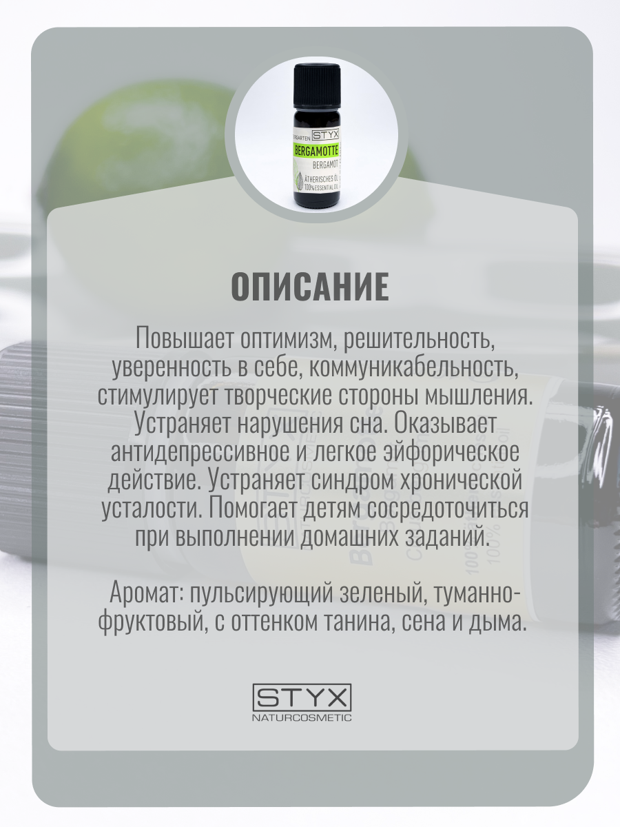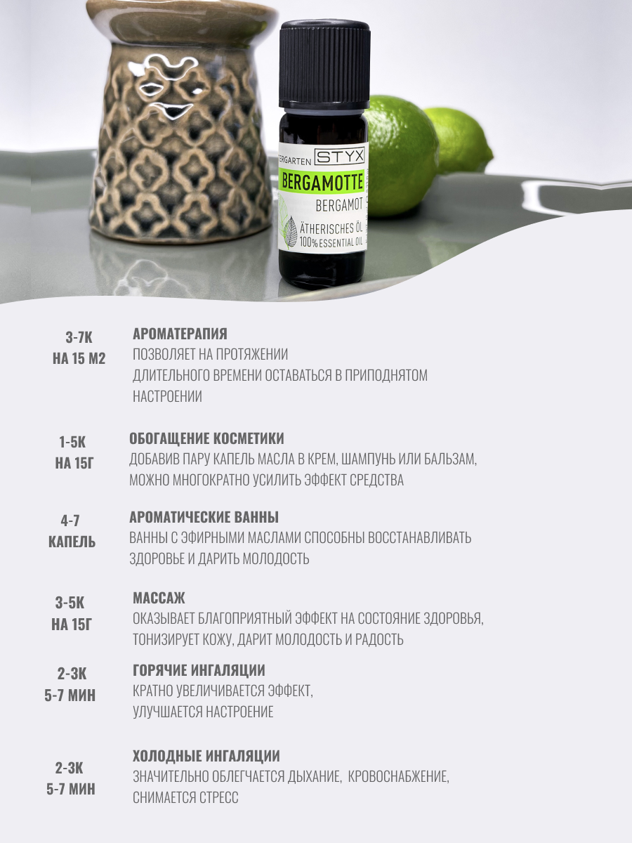 | Полное наименование | STYX эфирное масло Бергамот 10 мл |