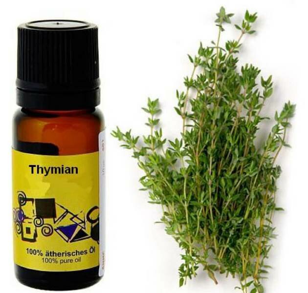 Регенерирует, укрепляет волосы, устраняет их выпадение и алопецию. Мощный антисептик, противовоспалительный препарат: устраняет бактериально-вирусные дерматиты, инфильтраты, мокнущую экзему, чесотку. Противопедикулезное. Противозудное. Фунгицидное. Смягчающее и отхаркивающее действие. Гиппократ и Диоскорид применяли тимьян для лечения инфекционных заболеваний, обеззараживания воды, пищи, бытовых предметов. В Египте применялось для бальзамирования. Устраняет преждевременное семяизвержение, простатиты. Применялся при педикулезе, гельминтозах. Считалось одним из наиболее действенных средств против облысения.