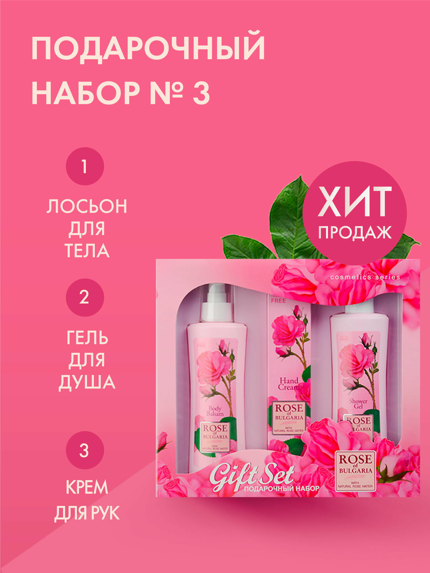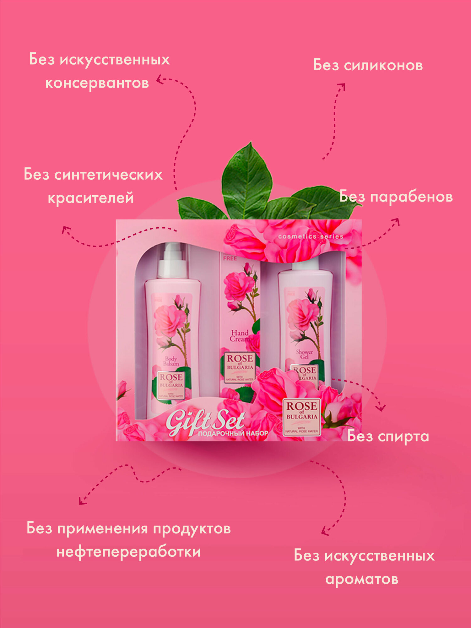 Лосьон для тела: Изысканная нежность и мягкость кожи надолго! Лосьон для тела “Rose of Bulgaria” имеет легкую текстуру и нежный приятный аромат, быстро впитывается и не оставляет следов на одежде. Прекрасно увлажняет и смягчает кожу, обеспечивает необходимое питание, восстанавливает защитные свойства кожи. Надолго возвращает ощущение комфорта. Формула лосьона содержит уникальную розовую воду с большим содержанием эфирного розового масла, витамин Е и экстракт розмарина. После применения лосьона кожа становится гладкой, нежной и бархатистой.Уникальная натуральная композиция включает в себя розовую воду с большим содержанием эфирного розового масла, витамин Е и экстракт розмарина. Формула создана специально для заботы о коже, ежедневно подвергающейся агрессивному воздействию окружающей среды. Восстанавливает клеточный метаболизм. Прекрасно впитывается. Поддерживает необходимый водно-жировой баланс, обладает противовоспалительным и антиаллергическим действием, оказывает успокаивающее воздействие на кожу. Сохраняет ее эластичность и мягкость, радуя нежным ароматом цветков розы.Представлен в двух видах: с помпой-дозатором (230 ml) и без дозатора (330 ml).Гель для душа: Нежный и деликатный душ–гель для ежедневной гигиены тела. Эффективно смывает загрязнения, не нарушая физиологический баланс кожи. Содержит уникальную болгарскую натуральную розовую воду с большим содержанием эфирного розового масла, обладающим отличными антибактериальными свойствами. Гель не раздражает и не сушит кожу, создает длительное чувство чистоты и комфорта.Трудно отказать себе в удовольствии принять душ, используя гель с нежным ароматом лепестков розы. Благодаря эффекту натуральной розовой воды с большим содержанием эфирного розового масла и густой пены, гель деликатно очищает кожу, делая ее бархатистой и нежной, снимает усталость и стресс. Гель обеспечивает коже необходимое питание и увлажнение, оказывает противовоспалительное и антисептическое действие. Гель также создает длительное ощущение чистоты и комфорта.Крем для рук: Мягкий, легко впитывающийся крем для заботы о Ваших руках. Благодаря содержанию розовой воды, крем обладает антибактериальным и успокаивающим свойствами, обеспечивает долговременную защиту кожи от недостатка влаги. Натуральное миндальное масло, экстракт календулы и розмарина интенсивно питают кожу Ваших рук, способствуют активному протеканию естественных процессов восстановления, даруя жизненные силы и делая ее мягкой и шелковистой. Крем позволяет эффективно ухаживать за кожей рук, даря неповторимое ощущение комфорта.Крем для рук „ROSE OF BULGARIA“ обеспечивает комплексный уход за кожей. Содержит натуральную розовую воду, имеющую антибактериальные и успокаивающие свойства. Благодаря миндальному маслу, экстрактам календулы и розмарина кожа рук интенсивно питается, смягчается и защищена от вредных атмосферных влияний. Крем придает неповторимое ощущение комфорта и эластичности сухой и увядшей коже.