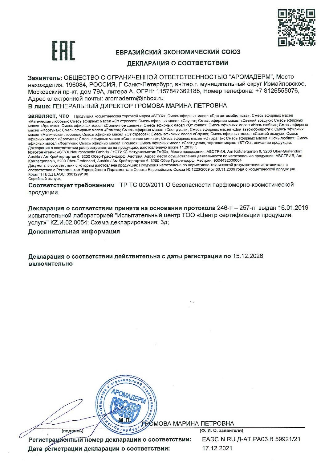 | Полное наименование | Эфирное масло СТИКС Свежий Воздух 10мл |