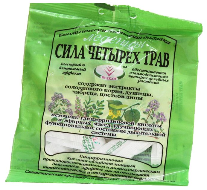 Леденцы "Сила четырех трав" с сахаром- являются источником глицирризиновой кислоты. Оказывают противовоспалительное, противогриппозное, отхаркивающее средство. Применяются при заболеваний дыхательных путей с трудно отделяемой мокротой (аллергического ринита), ветряной оспы. Экстракты солодкового корня, душицы, чабреца и цветков липы успокаивают кашель и першение в горле при простудных и острых респираторных заболеваниях верхних дыхательных путей, укрепляют желудок при гастритах, снижают изжогу при заболеваниях желудочно-кишечного тракта, успокаивают нервную систему и нормализуют сон.