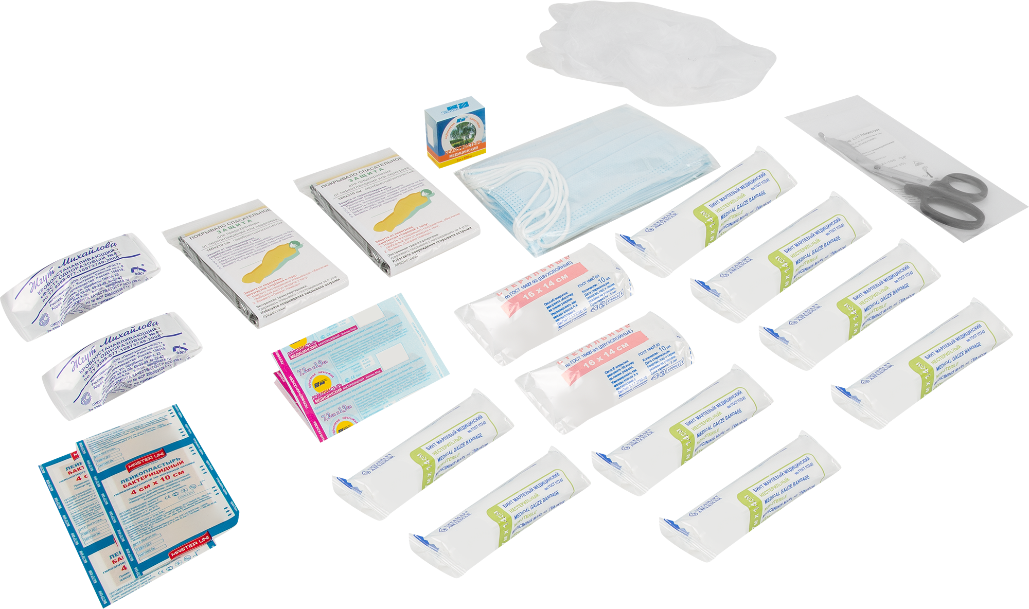 | Комплектация | маска медицинская нестерильная одноразовая - 10 шт, перчатки медицинские нестерильные, размером не менее м - 2 пары, устройство для проведения искусственного дыхания «Рот-Устройство-Рот» - 1 шт, жгут кровоостанавливающий для остановки артериального кровотечения - 1 шт, бинт марлевый медицинский размером не менее 5 м х 10 см- 4 шт6Бинт марлевый медицинский размером не менее 7 м х 14 см- 4 шт, салфетки марлевые медицинские стерильные размером не менее 16 х 14 см №10 - 2 уп, лейкопластырь фиксирующий рулонный размером не менее 2 х 500 см - 1 шт, лейкопластырь бактерицидный размером не менее 1,9 х 7,2 см - 10 шт, лейкопластырь бактерицидный размером не менее 4 х 10 см- 2 шт, покрывало спасательное изотермическое размером не менее 160 х 210 см- 2 шт, ножницы для разрезания повязок - 1 шт, инструкция по оказанию первой помощи с применением аптечки для оказания первой помощи работникам - 1 шт, футляр - 1 шт |