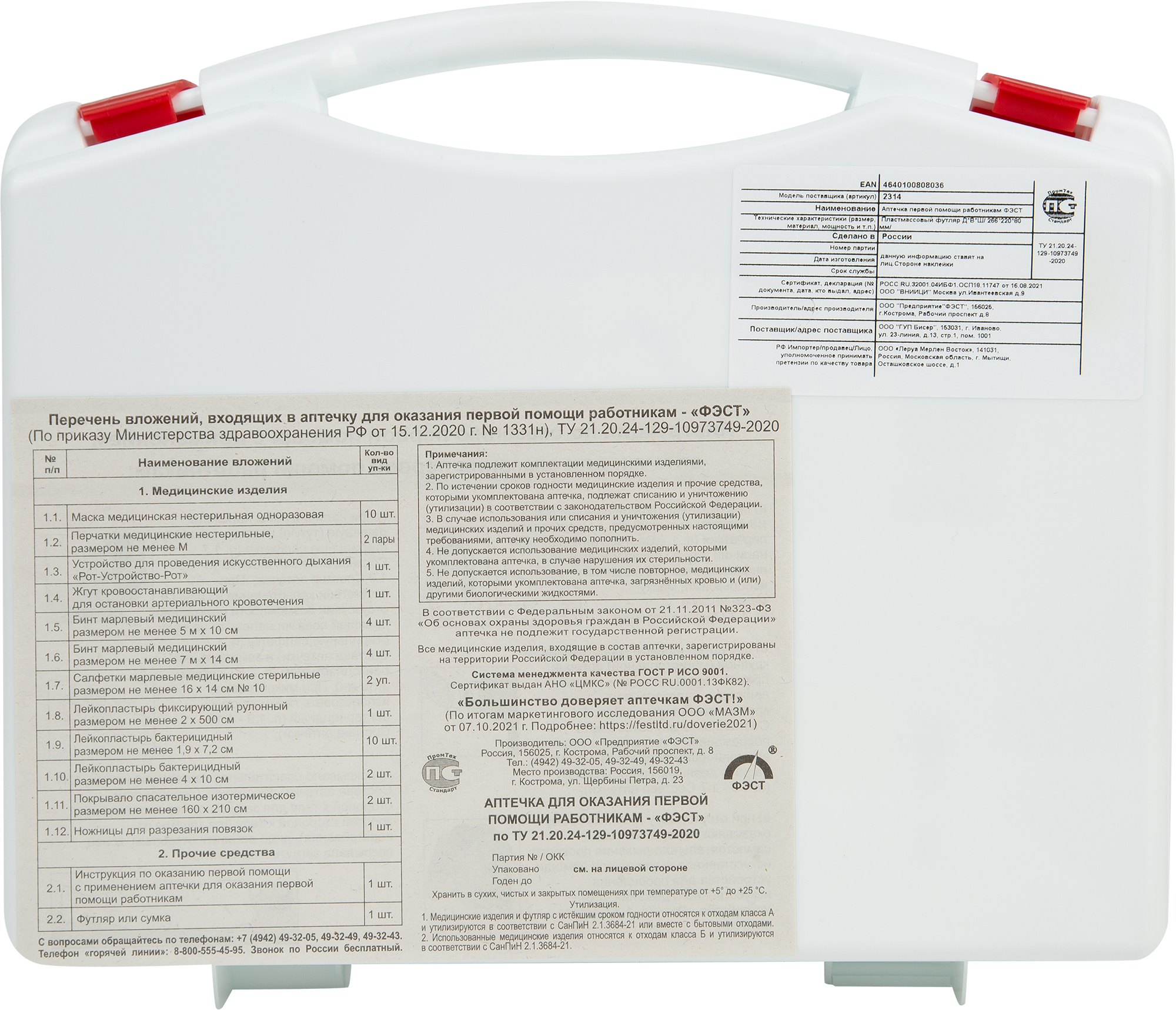 Состав: 1 Маска медицинская нестерильная одноразовая 10 шт.2 Перчатки медицинские нестерильные, размером не менее М 2 пары3 Устройство для проведения искусственного дыхания «Рот-Устройство-Рот» 1 шт.4 Жгут кровоостанавливающий для остановки артериального кровотечения 1 шт.5 Бинт марлевый медицинский размером не менее 5 м х 10 см 4 шт6 Бинт марлевый медицинский размером не менее 7 м х 14 см 3 шт.7 Салфетки марлевые медицинские стерильные размером не менее 16 х 14 см № 10 2 уп.8 Лейкопластырь фиксирующий рулонный размером не менее 2 х 500 см 1 шт.9 Лейкопластырь бактерицидный размером не менее 1,9 х 7,2 см 10 шт.10 Лейкопластырь бактерицидный размером не менее 4 х 10 см 2 шт.11 Покрывало спасательное изотермическое размером не менее 160 х 210 см 2 шт.12 Ножницы для разрезания повязок 1 шт.13 Инструкция по оказанию первой помощи с применением аптечки для оказания первой помощи работникам 1 шт.14 Футляр или сумка 1 шт.Страна производства: Россия
