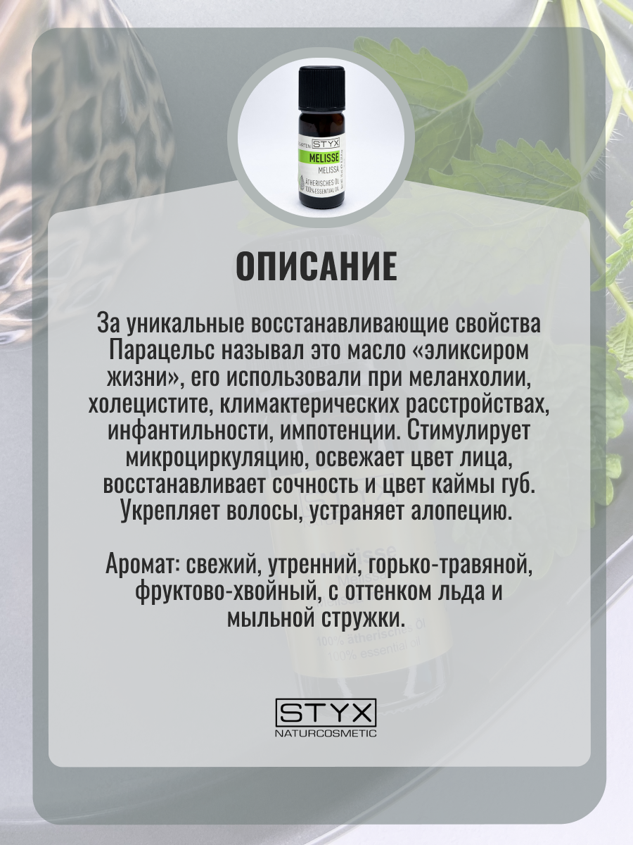 | Состав набора | Стикс Эфирное масло мелисса 10мл |