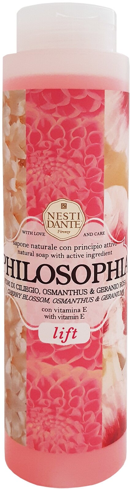Философия этой коллекции заключается в том, что обычный ритуал ухода можно превратить в ритуал любви к своему телу и заботы о нем. Гель для душа Lift (Лифтинг) обладает нежным ароматом цветущей вишни и нежного османтуса. Ретинол (retinyl acetate) эффективный антиоксидант: повышает упругость кожи, выравнивает тон и рельеф, увлажняет и удерживает влагу. Токоферол (tocopheryl acetate) эффективен как антиоксидант, предотвращает окисление ненасыщенных липидов. Обладает витаминной активностью, проникая в глубокие слои эпидермиса гидролизуется в витамин Е. Жидкое мыло и гели Nesti Dante производится исключительно из растительных масел и содержит 100% оливковое масло. Содержащееся в продуктах оливковое масло известно как «эликсир молодости» благодаря высокой концентрацией витамина Е, который помогает бороться с образованием свободных радикалов, повинных в старении кожи. В 1947 году Нести Данте основал мануфактуру по ручному производству мыла в предместьях Флоренции, Италия. Компания NESTI DANTE изготавливает мыло традиционным «марсельским методом» (методом котла). Каждый сорт мыла варится в течение 5 дней, затем мыло отстаивается и расслаивается. Осадок с щелочью и загрязняющими компонентами вымывают водой. При таком способе производства мыло не содержит вредных веществ и прекрасно пенится. Затем мыльную основу высушивают и удаляют избыток воды. Для однородности массы мыло несколько раз перетирают. На завершающем этапе в мыльную массу добавляют экстракты растений и ароматизирующие вещества.Пройдя полный цикл производства мыло NESTI DANTE приобретает структуру наивысшего качества, высокую плотность и нежность, мыло не рассыхается, не размокает в мыльнице и остается цельным длительное время (в отличие от недорогих сортов мыла).NESTI DANTE одна из немногих компаний в мире, которая до сих пор производит мыло традиционным методом, сохраняя полный цикл производства.