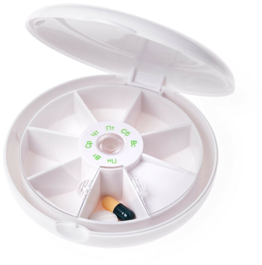 Описание: Таблетница на семь дней состоит из 2-х блоков. Первый блок содержит 6 пронумерованных отделений, в каждое из которых помещается ежедневная доза необходимых лекарств или витаминов. Второй блок состоит из 4-х отделений, для распределения лекарственных средств или витаминов в соответствии с суточным режимом приема: утро, день, вечер, ночь. Таблетницы предназначены для компактного и упорядоченного хранения лекарственных средств или витаминов. - Изготовлены из безопасного, легко моющегося пластика - Удобные и простые в использовании - Легко помещаются и переносятся в сумке.Технические характеристики товара могут отличаться от указанных на сайте, уточняйте технические характеристики товара на момент покупки и оплаты. Вся информация на сайте о товарах носит справочный характер и не является публичной офертой в соответствии с пунктом 2 статьи 437 ГК РФ. Убедительно просим Вас при покупке проверять наличие желаемых функций и характеристик.Все товары, реализуемые интернет-магазином, являются абсолютно новыми и имеют срок гарантийного обслуживания в сервисных центрах производителей или в сервисном центре онлайн трейд. РУ. Покупатели, приобретающие цифровое фото и видео, периферийные устройства, коммуникаторы или другую технику в нашем магазине, вместе с товаром получают кассовый чек и гарантийный талон с печатью нашего магазина. Перейти в раздел гарантийные обязательства