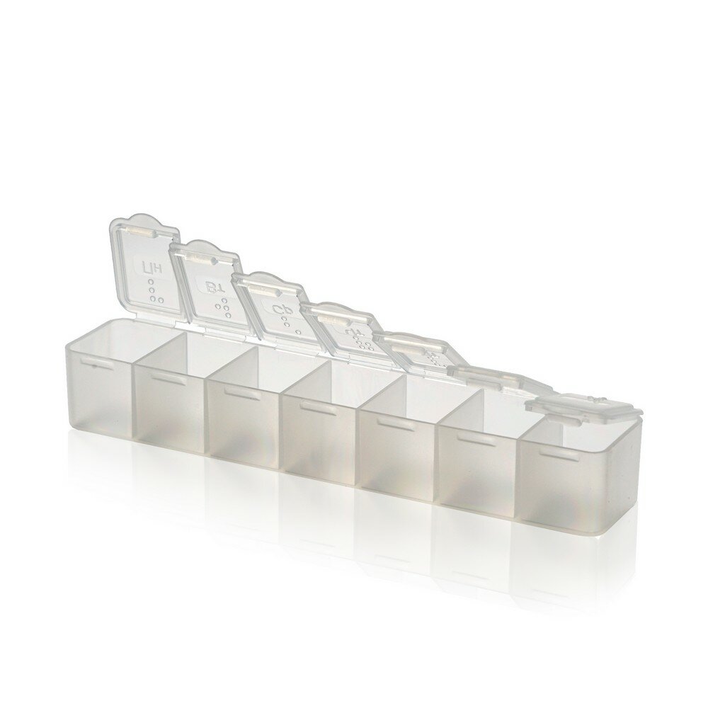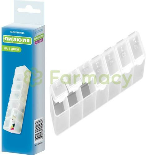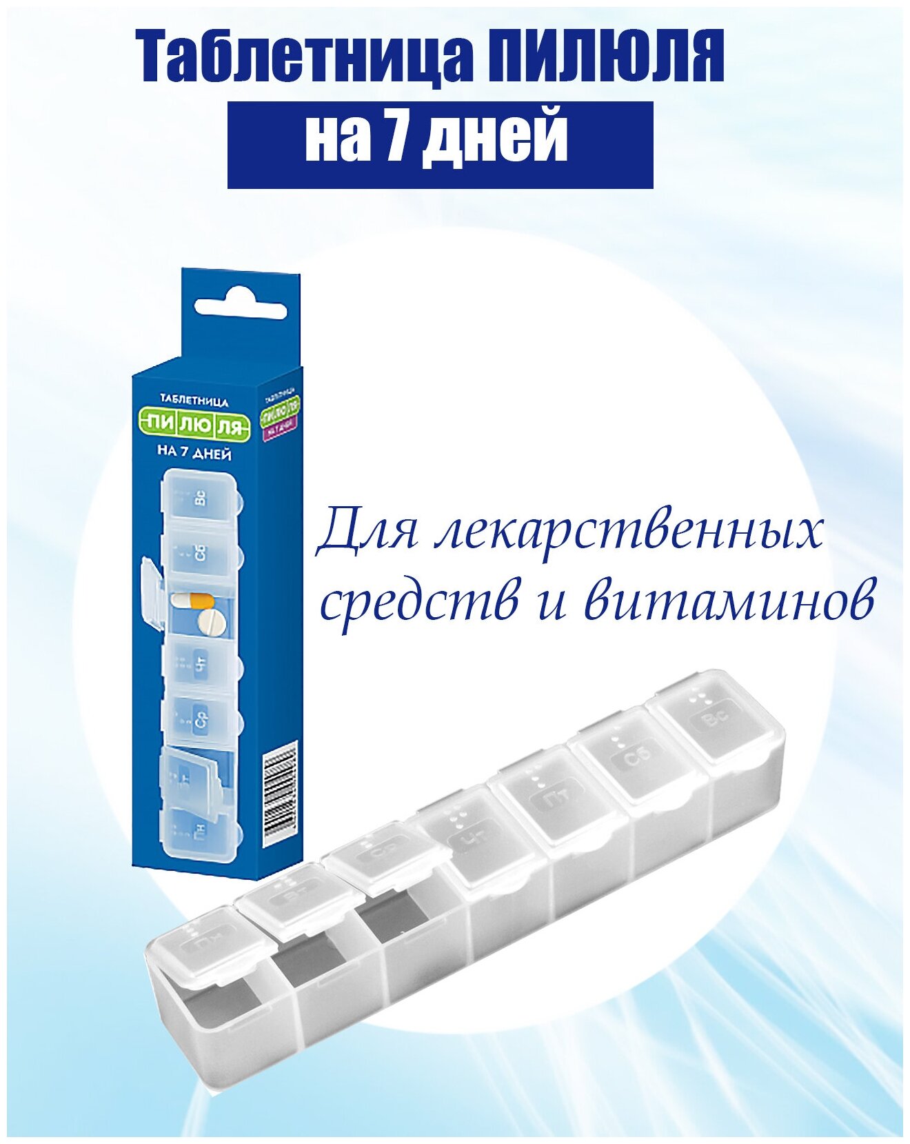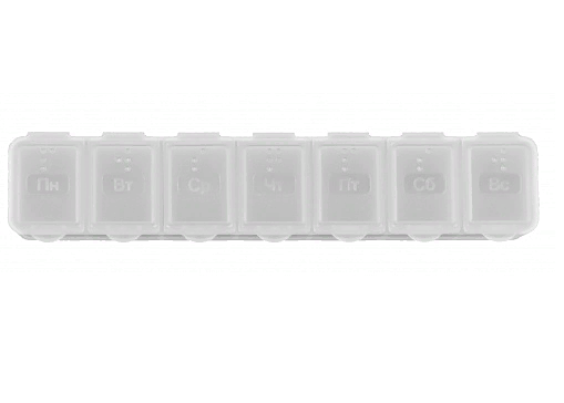 Таблетница на семь дней состоит из 7-ми отделений, которые соответствуют дням недели. Для людей с ослабленным зрением нанесены символы Брайля. Предназначена для компактного и упорядоченного хранения лекарственных средств или витаминов. Изготовлена из безопасного, легко моющегося пластика. Удобная и простая в использовании. Легко помещается и переносится в сумке.Технические характеристики товара могут отличаться от указанных на сайте, уточняйте технические характеристики товара на момент покупки и оплаты. Вся информация на сайте о товарах носит справочный характер и не является публичной офертой в соответствии с пунктом 2 статьи 437 ГК РФ. Убедительно просим Вас при покупке проверять наличие желаемых функций и характеристик.Все товары, реализуемые интернет-магазином, являются абсолютно новыми и имеют срок гарантийного обслуживания в сервисных центрах производителей или в сервисном центре онлайн трейд. РУ. Покупатели, приобретающие цифровое фото и видео, периферийные устройства, коммуникаторы или другую технику в нашем магазине, вместе с товаром получают кассовый чек и гарантийный талон с печатью нашего магазина. Перейти в раздел гарантийные обязательства