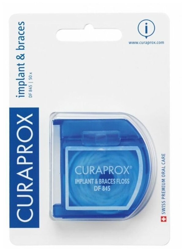| Полное наименование | Зубная нить межзубная Curaprox "Implant & Braces" DF 845, 50 шт по 27,3 см |