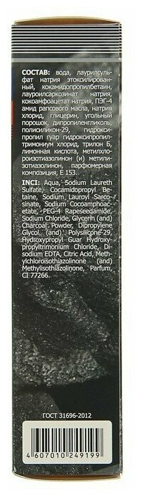 | Состав | вода; гидроксипропил гуар гидроксипропилтримониум хлорид; глицерин; дипропиленгликоль; Е 153; кокамидопропилбетаин; кокоамфоацетат натрия; лаурилсульфат натрия этоксилированный; лауроилсаркозинат натрия; лимонная кислота; метилхлороизотиазолинон (и) метилизотиазолинон; натрия хлорид; парфюмерная композиция; полисиликон-29; ПЭГ-4 рапсового масла; трилон Б; угольный порошок |