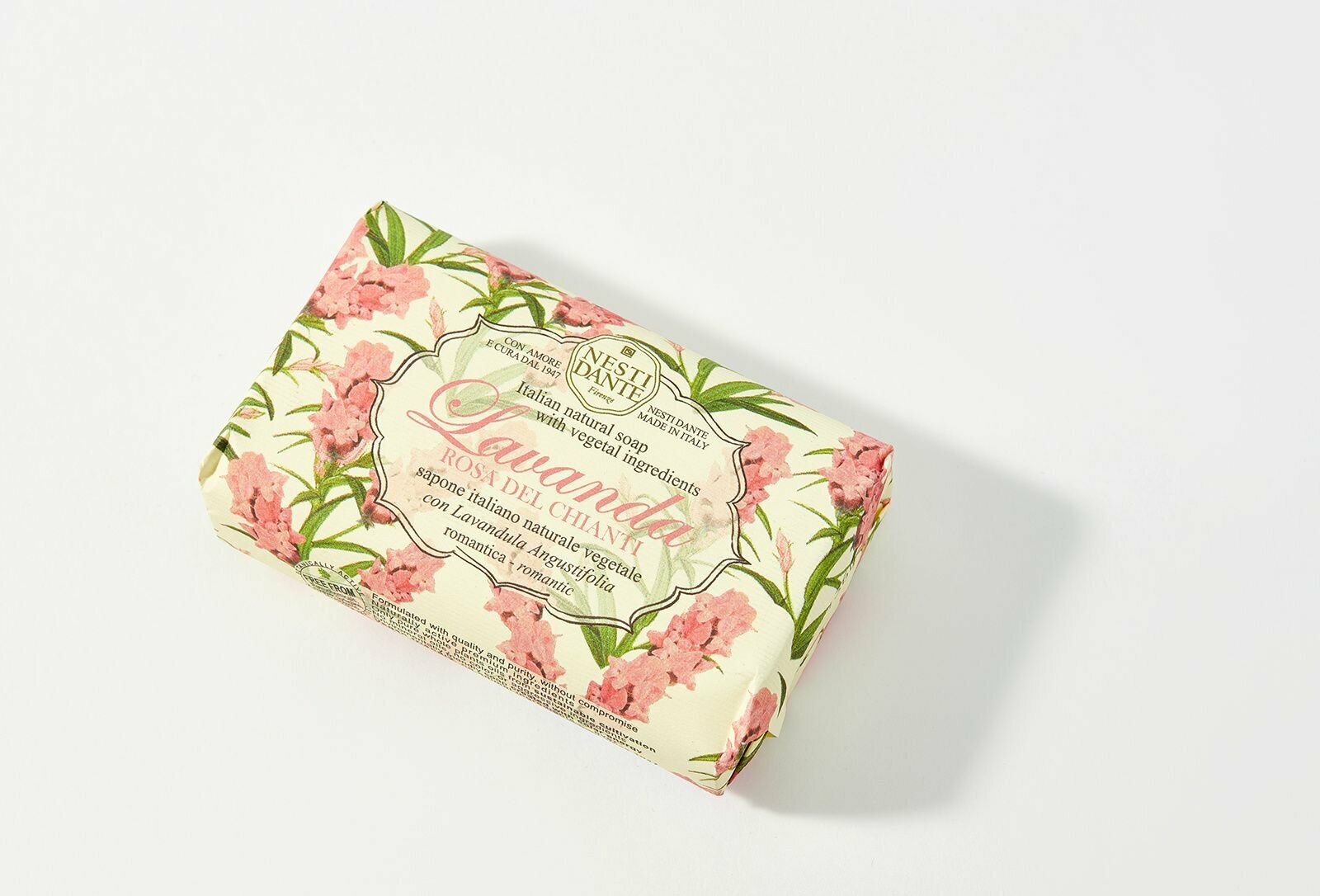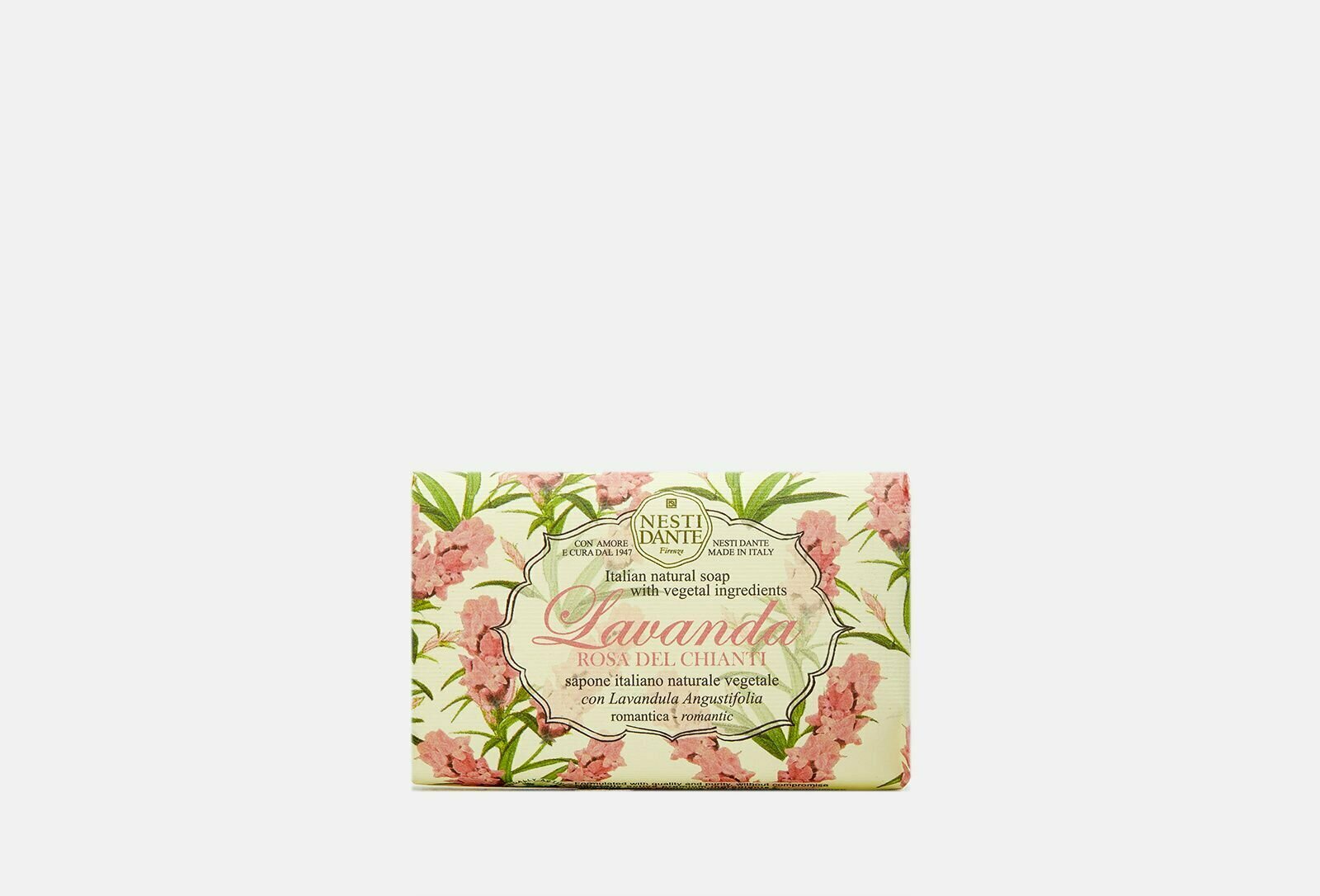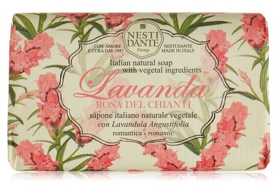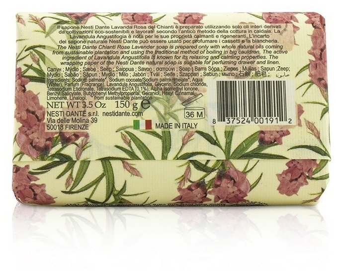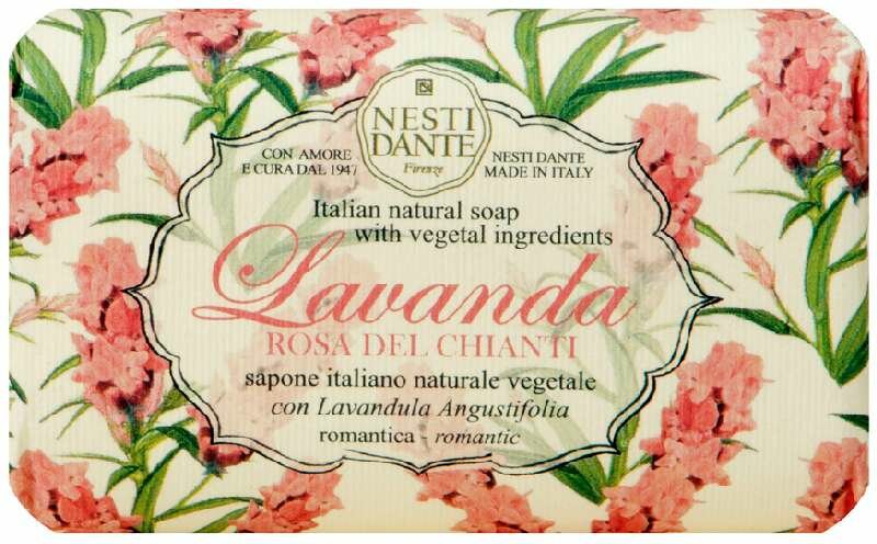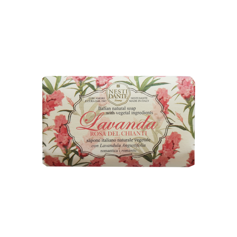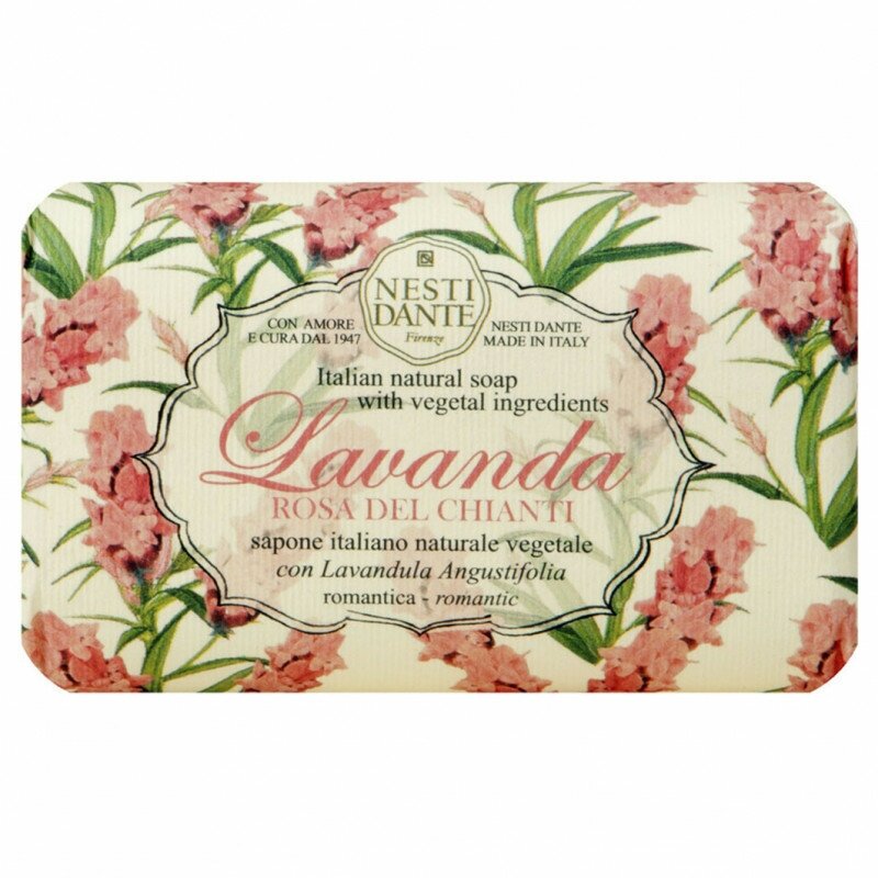 Nesti Dante — экологически чистое мыло, обогащенное растительными экстрактами и маслами. Производится во Флоренции с 1947 года по старинной котловой технологии варки мыла. Не содержит вредных поверхностно-активных веществ, сульфатов, парабенов, синтетических масел и искусственных красителей. Без аллергенов и ингредиентов животного происхождения. Мыло не размокает и быстро восстанавливается после длительного контакта с водой.Древняя легенда гласит, что изгнанным из рая Адаму и Еве Бог подарил полезные травы, чтобы облегчить их тяжесть земной жизни. Среди них были розмарин и лаванда - розмарин для поддержания духа, лаванда для услаждения души. Линия мыла Lavanda гармонизирует тело и душу.Rosa del Chianti (Лаванда розовое Кьянти) обладает нежным цветочным сладковатым ароматом, без выраженных акцентов лаванды. Лаванда (lavandula angustifolia) обладает выраженным регенерирующим действием, хорошо очищает, снимает раздражение и уменьшает шелушение, питает и увлажняет кожу, оказывает антисептический эффект.