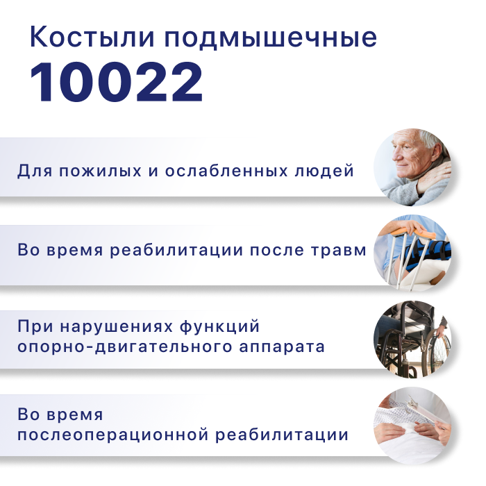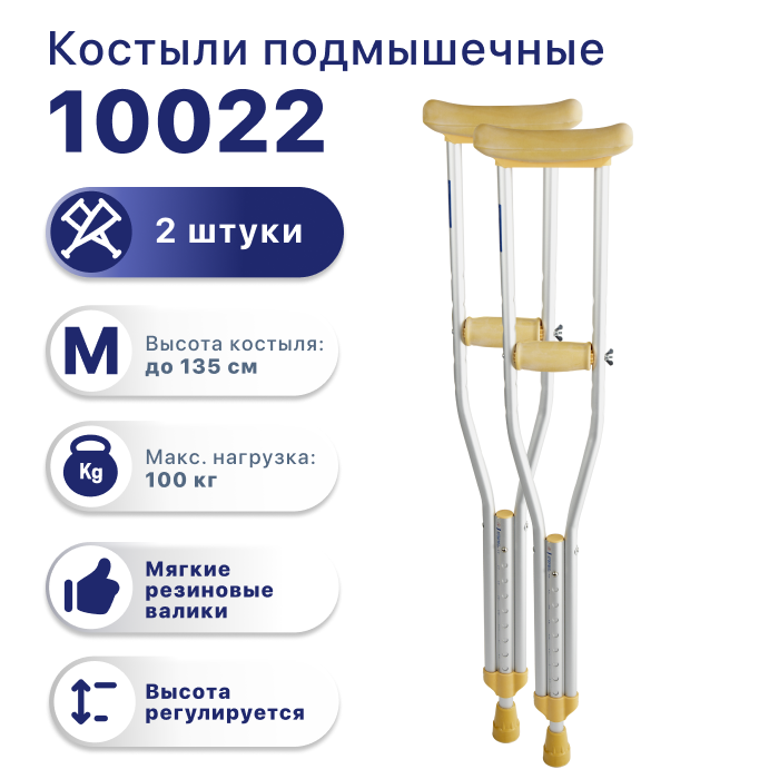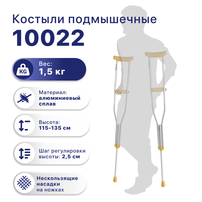 Костыли с подмышечной опорой удобные и легкие. 10022 – модель алюминиевых костылей с регулируемой по высоте рукояткой и мягким подмышечным валиком.Подходят для пользователей с ростом от 150 до 180 см.Когда нужно снять нагрузку с нижних конечностей (травма, послеоперационный период), используются костыли.При этом основная нагрузка переносится на руки и плечевой пояс.В домашних условиях нужно отрегулировать их размер под индивидуальные параметры для удобства пользования.Регулируемые подмышечные костыли предназначены для ускоренного обучения ходьбе, ритмичности движений, выработки равновесия в процессе выздоровления детей и взрослых, перенесших травмы ног.Материал: алюминий;Шаг регулировки высоты рукоятки: 4 см.Шаг регулировки высоты костыля: 2,5 см.Максимальная нагрузка: 100 кг.Размеры: измеряется высота от пола до подмышки: регулировка высоты от 115 до 135 см.