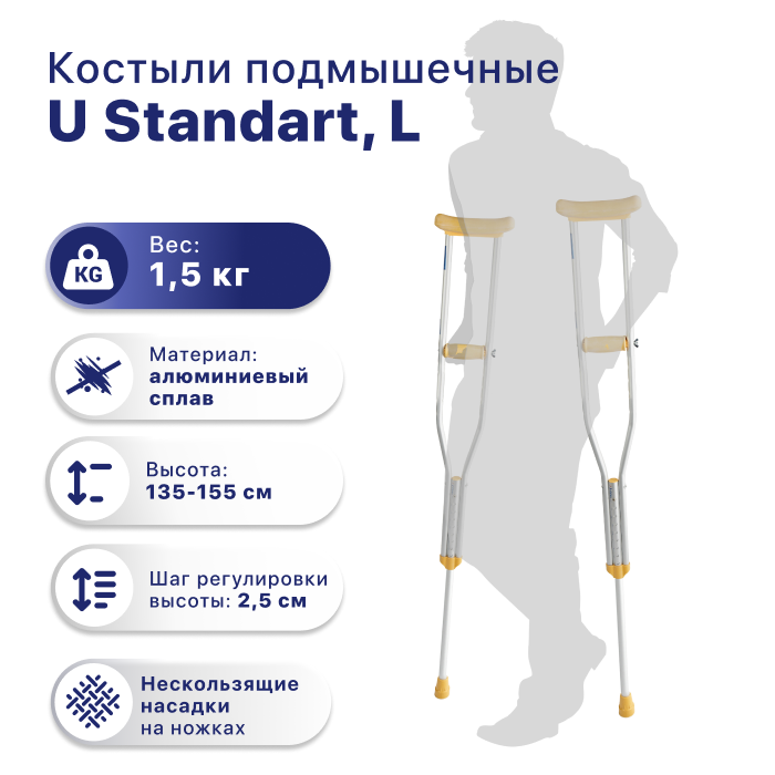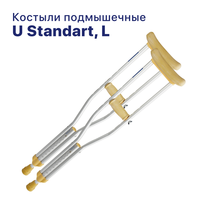U Standart – модель легких алюминиевых костылей с опорами для рук и подмышечных впадин. Высота шафта и опора для руки регулируются, что позволяет настроить U Standart и сделать передвижение с ним максимально комфортным и безопасным.Для лучшей устойчивости модель оснащена резиновым наконечником. Мягкие опоры костыля легко снимаются и поддаются чистке.Размер L: высота от пола до подмышечного валика: 135-155примерный рост: 175-200 см (требуются индивидуальные измерения)вес пары: 1,8 кг.Особенности:Алюминиевые костыли.Три размера.Регулировка по высоте.Мягкий, регулируемый по высоте валик;Максимальная нагрузка: 100 кг.