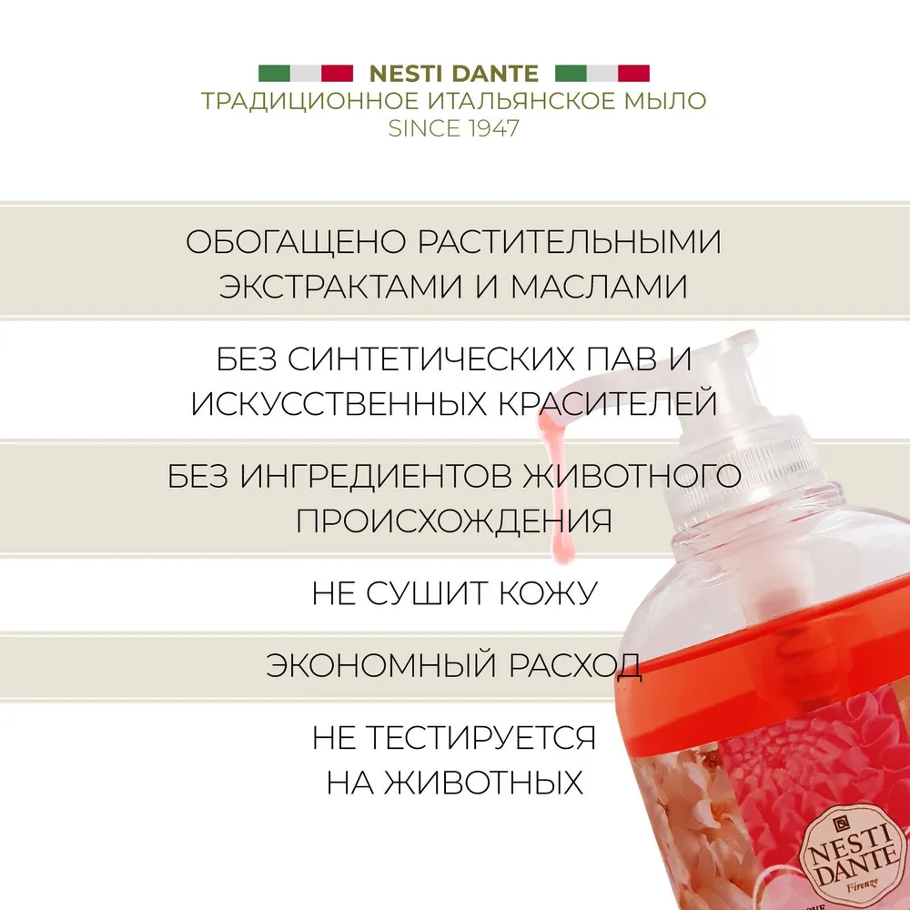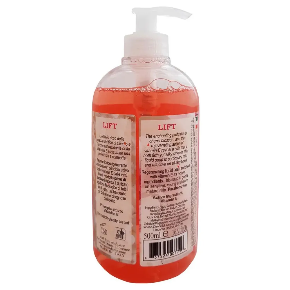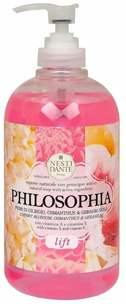 Жидкое мыло Lift (Лифтинг) обладает нежным ароматом цветущей вишни и нежного османтуса. Ретинол (retinyl acetate) эффективный антиоксидант: повышает упругость кожи, выравнивает тон и рельеф, увлажняет и удерживает влагу. Токоферол (tocopheryl acetate) эффективен как антиоксидант, предотвращает окисление ненасыщенных липидов. Обладает витаминной активностью, проникая в глубокие слои эпидермиса гидролизуется в витамин Е. Жидкое мыло и гели Nesti Dante производится исключительно из растительных масел и содержит 100% оливковое масло. Содержащееся в продуктах оливковое масло известно как «эликсир молодости» благодаря высокой концентрацией витамина Е, который помогает бороться с образованием свободных радикалов, повинных в старении кожи. В 1947 году Нести Данте основал мануфактуру по ручному производству мыла в предместьях Флоренции, Италия. Компания NESTI DANTE изготавливает мыло традиционным «марсельским методом» (методом котла). Каждый сорт мыла варится в течение 5 дней, затем мыло отстаивается и расслаивается. Осадок с щелочью и загрязняющими компонентами вымывают водой. При таком способе производства мыло не содержит вредных веществ и прекрасно пенится. Затем мыльную основу высушивают и удаляют избыток воды. Для однородности массы мыло несколько раз перетирают. На завершающем этапе в мыльную массу добавляют экстракты растений и ароматизирующие вещества.Пройдя полный цикл производства мыло NESTI DANTE приобретает структуру наивысшего качества, высокую плотность и нежность, мыло не рассыхается, не размокает в мыльнице и остается цельным длительное время (в отличие от недорогих сортов мыла).NESTI DANTE одна из немногих компаний в мире, которая до сих пор производит мыло традиционным методом, сохраняя полный цикл производства.