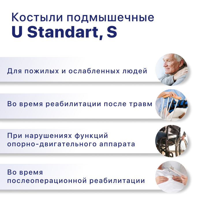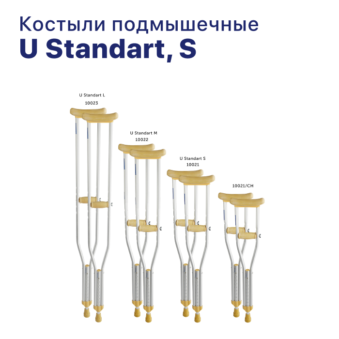 U Standart – модель легких алюминиевых костылей с опорами для рук и подмышечных впадин. Высота шафта и опора для руки регулируются, что позволяет настроить U Standart и сделать передвижение с ним максимально комфортным и безопасным.Для лучшей устойчивости модель оснащена резиновым наконечником. Мягкие опоры костыля легко снимаются и поддаются чистке.Размер S: высота от пола до подмышечного валика: 95 - 115 смпримерный рост: 130-155 смвес пары: 1,6 кг;Особенности:алюминиевые костыли;регулировка по высоте;мягкий, регулируемый по высоте валик;максимальная нагрузка: 100 кг.