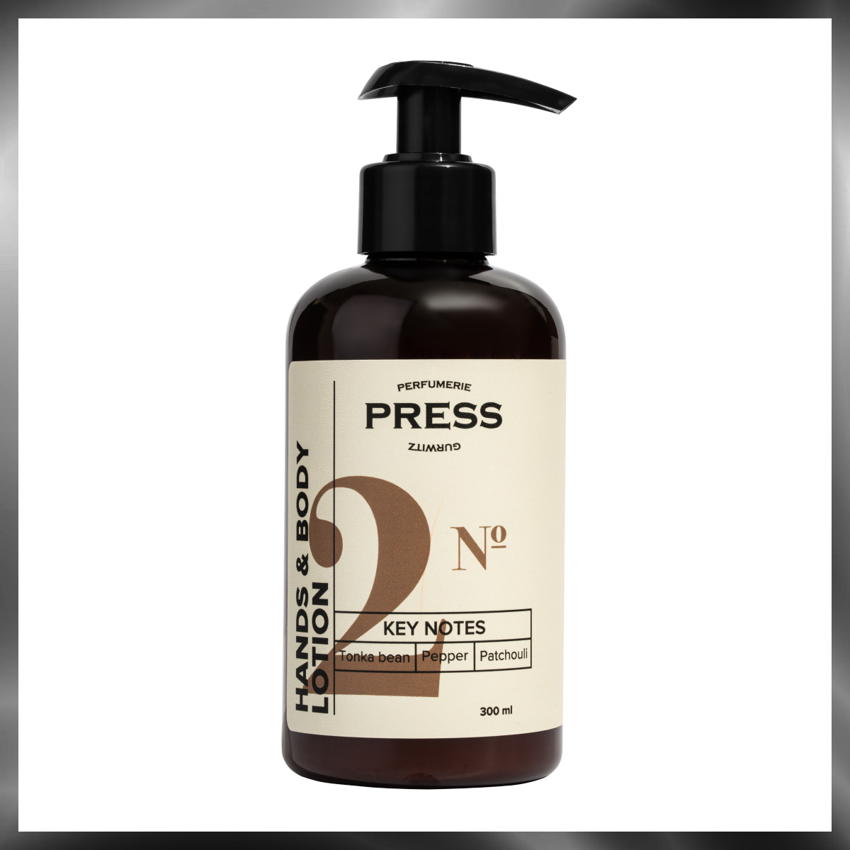 | Полное наименование | PRESS GURWITZ PERFUMERIE Лосьон для тела и рук увлажняющий №2 Черный перец, Бобы Тонка, Пачули, натуральное, парфюмированное 300 мл |