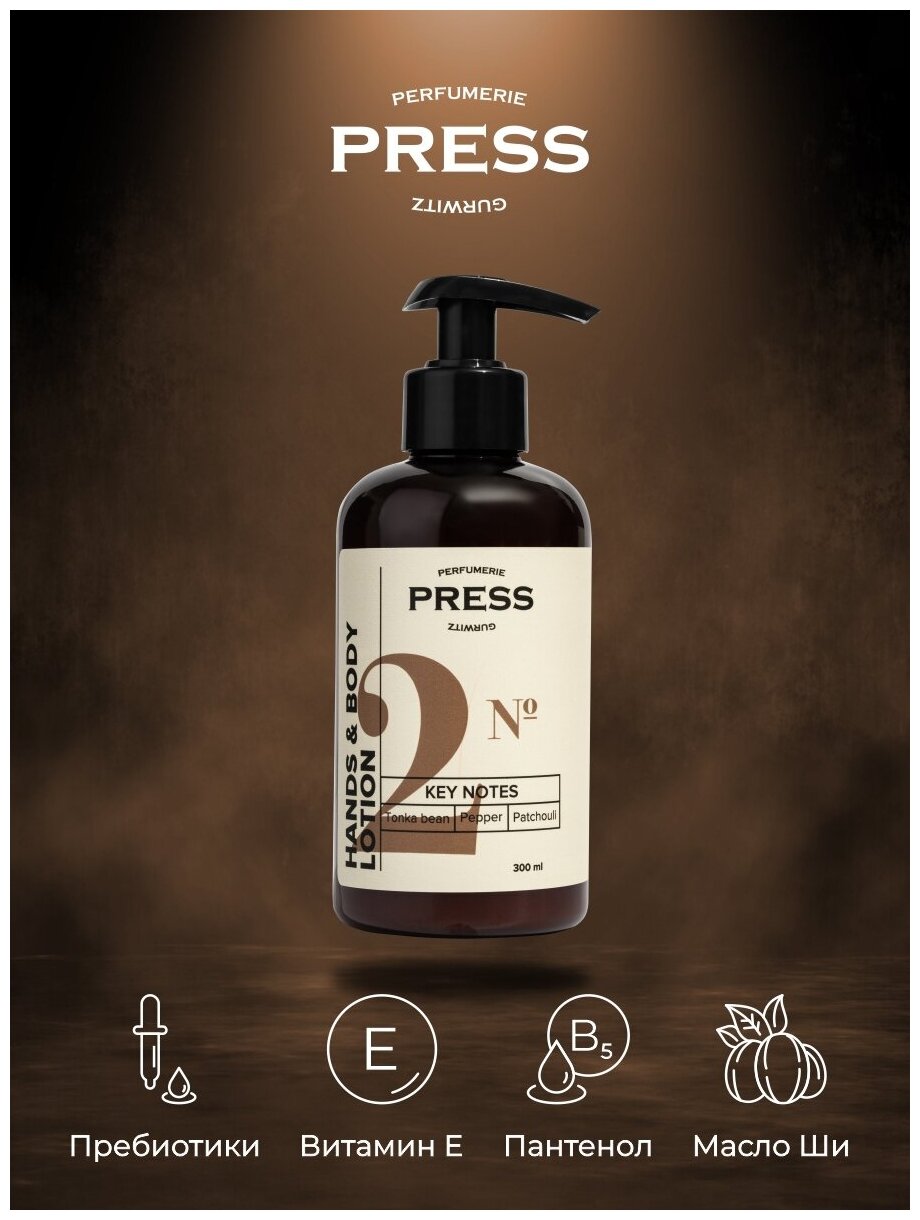 Пресс Гурвиц Парфюмери Лосьон увлажняющий для тела и рук №2 Бобы Тонка-Черный перец-Пачули 300мл Айкон Пакеджинг