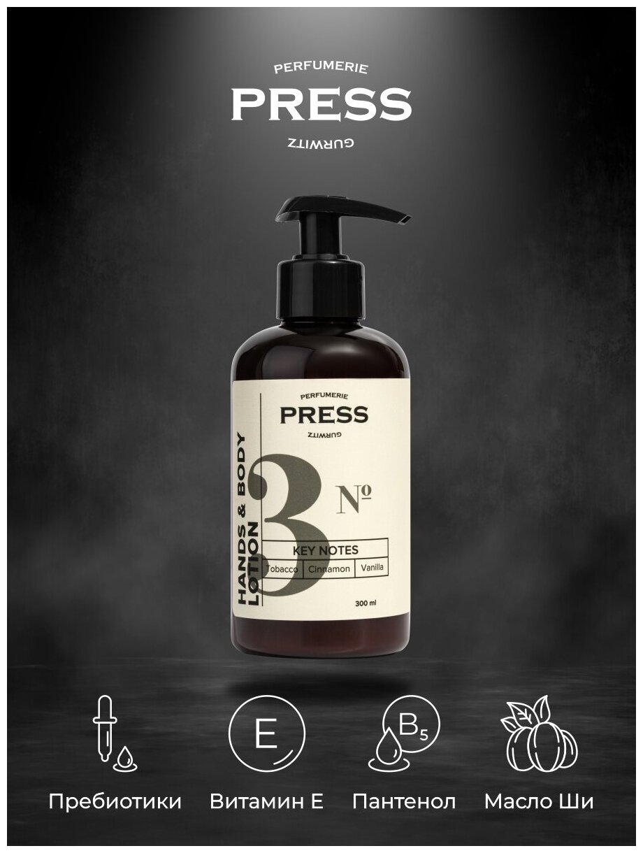 Увлажняющий лосьон для тела и рук Press Gurwitz Perfumerie быстро впитывается, глубоко увлажняет и восстанавливает гидролипидную пленку кожи. Дымчатый, уютный и пряный аромат. в котором ярко сочетаются ноты мадагаскарской ванили, табака, жгучей корицы. Гипоаллергенный лосьон содержит питательное масло ши, витамин Е и пантенол, благодаря которым кожа быстро восстанавливается и удерживает влагу, становится мягкой и ухоженной. Входящие в состав пребиотики защищают кожу от негативного воздействия окружающей среды. В коллекции используются селекционные авторские ароматы, которые остаются с вами надолго. Все ароматы унисекс.