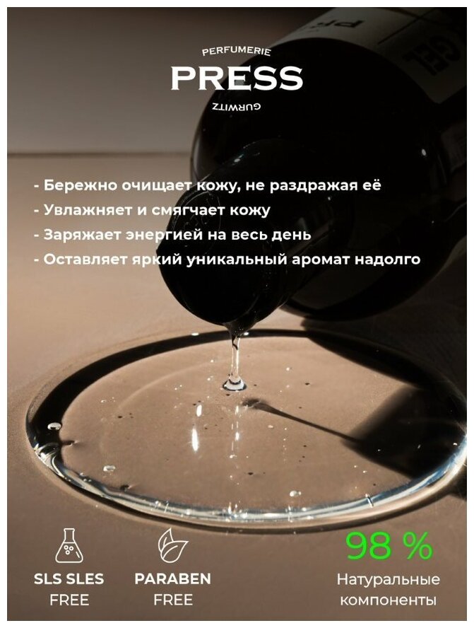 Гель для душа Press Gurwitz Perfumerie, обогащенный экстрактами алое вера, а также маслом авокадо и пантенолом, бережно очищает кожу и ухаживает за ней. Свежий и одновременно манящий аромат с нотами терпкого ветивера, нежной орхидеи и ароматного грейпфрута. Натуральный гель для душа хорошо увлажняет и питает кожу, восстанавливает ее защитные свойства, успокаивает и удерживает влагу внутри. Гипоаллергенный гель не сушит кожу и не нарушает естественный PH-баланс, наполняет кожу витаминами и аминокислотами, подходит даже для чувствительной кожи. В коллекции используются селекционные авторские ароматы, которые остаются с вами надолго. Все ароматы унисекс.