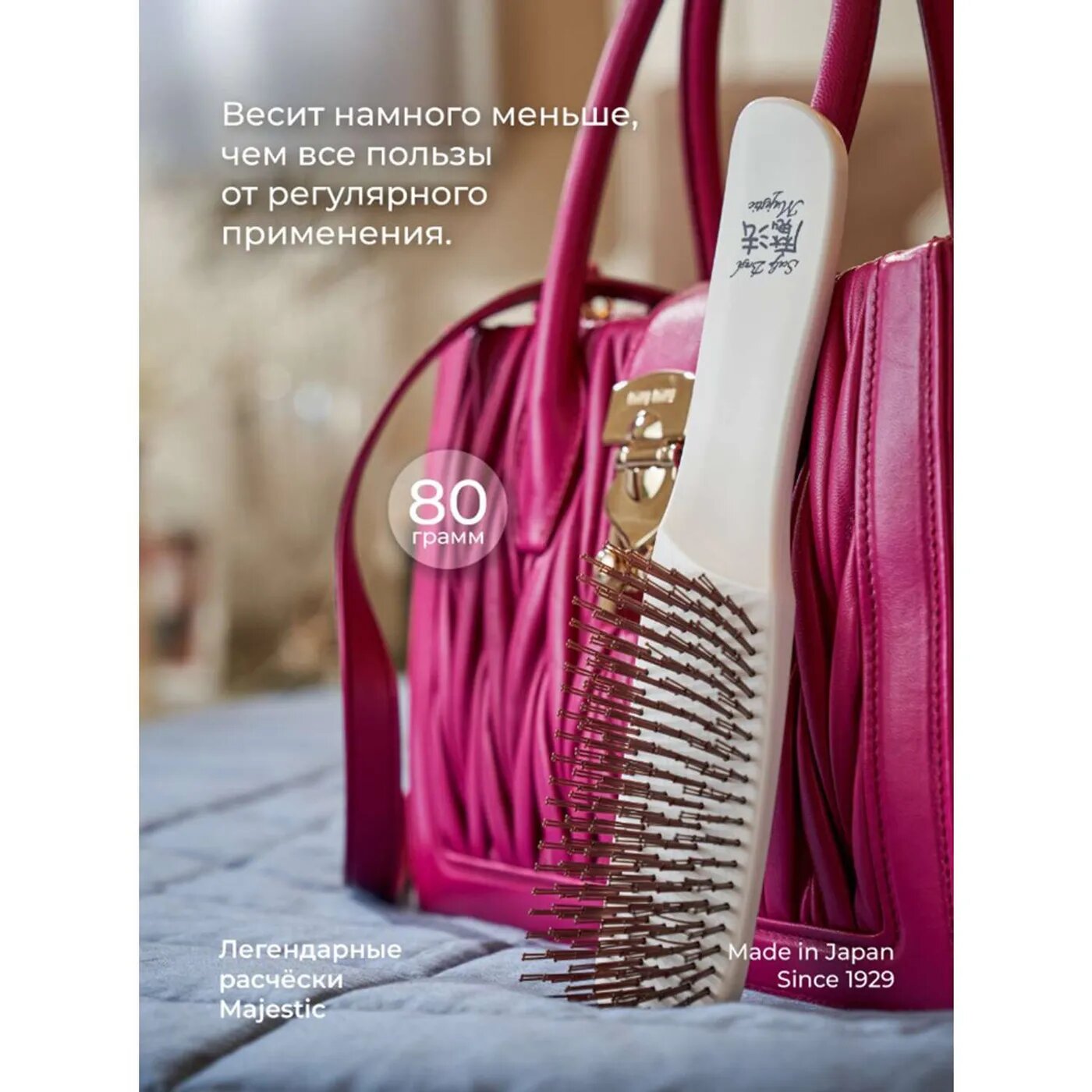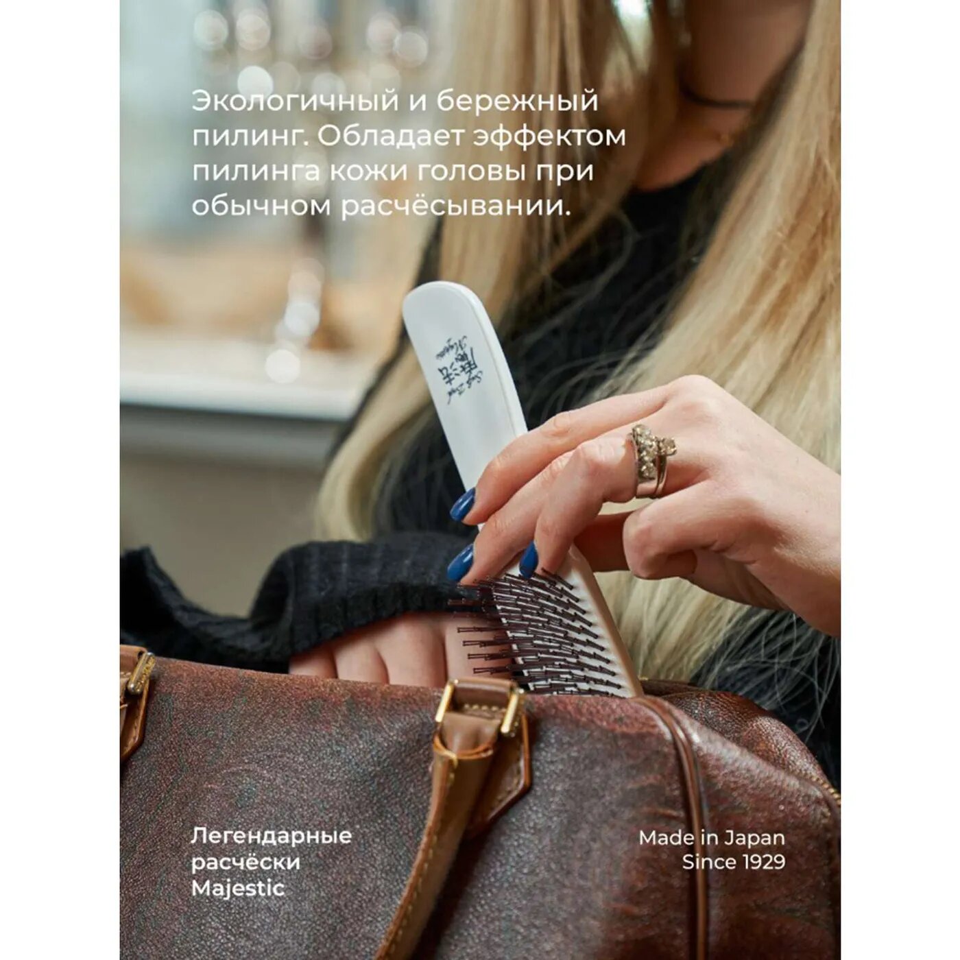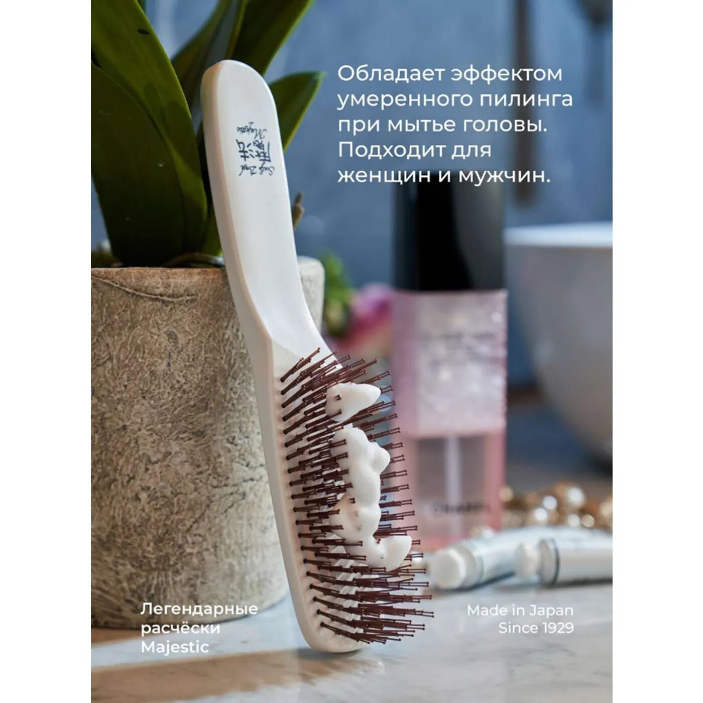 Трихологическа расческа Majestic Pearl White универсальная, для волос любого типа . Зубчики с литыми наконечниками тщательно очищают более сорока тысяч пор от скопившихся загрязнений, а эффект легкого пилинга обеспечивает устранение старых клеток - кожа начинает дышать. Массаж усиливает приток крови к корням волос - это благоприятно воздействует на волосяные фолликулы, в том числе спящие - к ним поступает больше микро- и макроэлементов. Волосы начинают расти быстрее, а при регулярном применении становятся гуще, сильнее, наполняются естественным блеском. Имеет 568 зубчиков