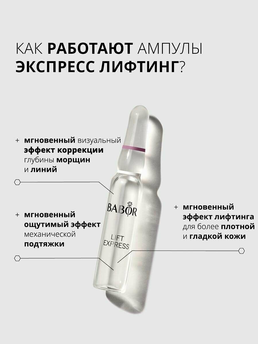 АМПУЛЫ ЭКСПРЕСС ЛИФТИНГ (LIFT EXPRESS): видимая коррекция морщин с мгновенным эффектом! Морские экзополисахариды и матрица мгновенного лифтинга InstantLift заметно сокращают глубину морщин и линий. 97%* участников тестирования отметили, что уже через 15 минут кожа кажется более подтянутой; 86%* назвали Ампулы Экспресс Лифтинг идеальным продуктом «на выход».