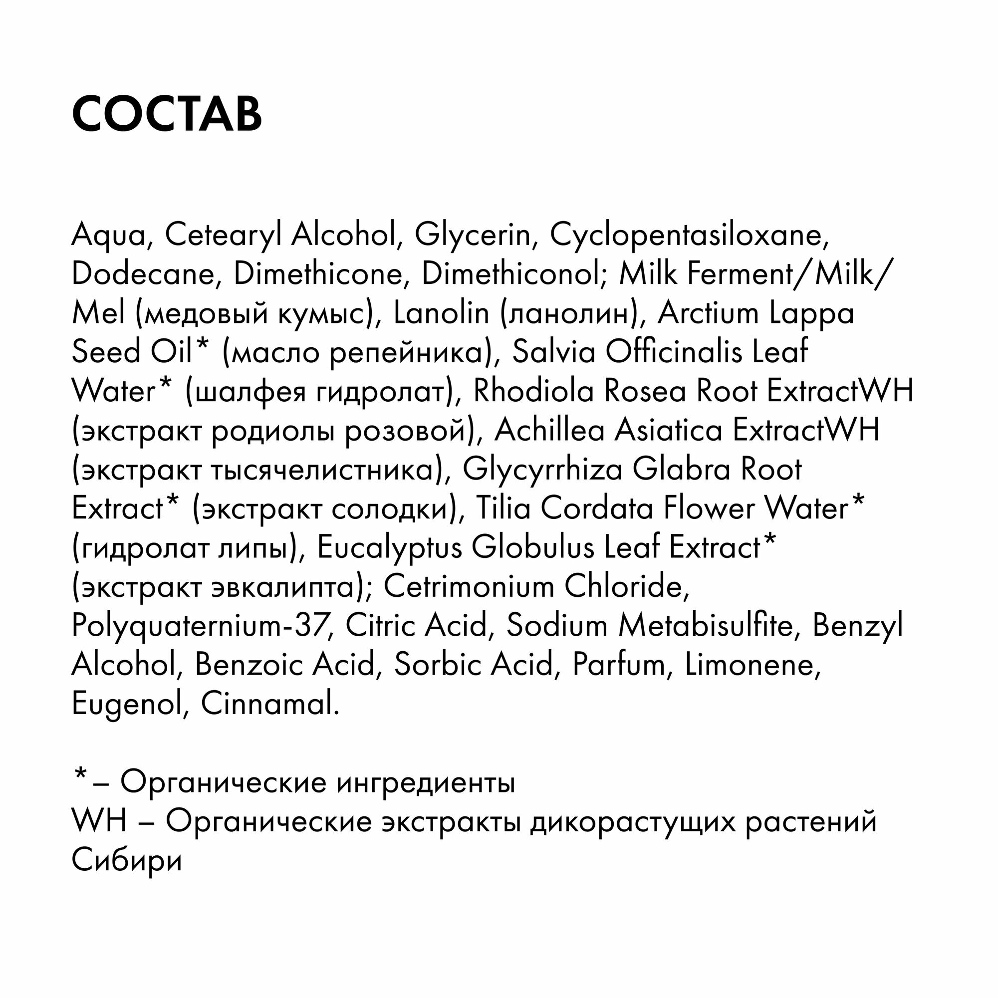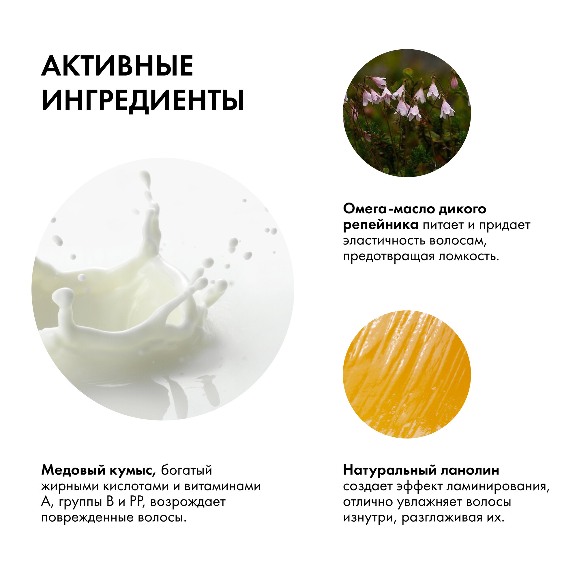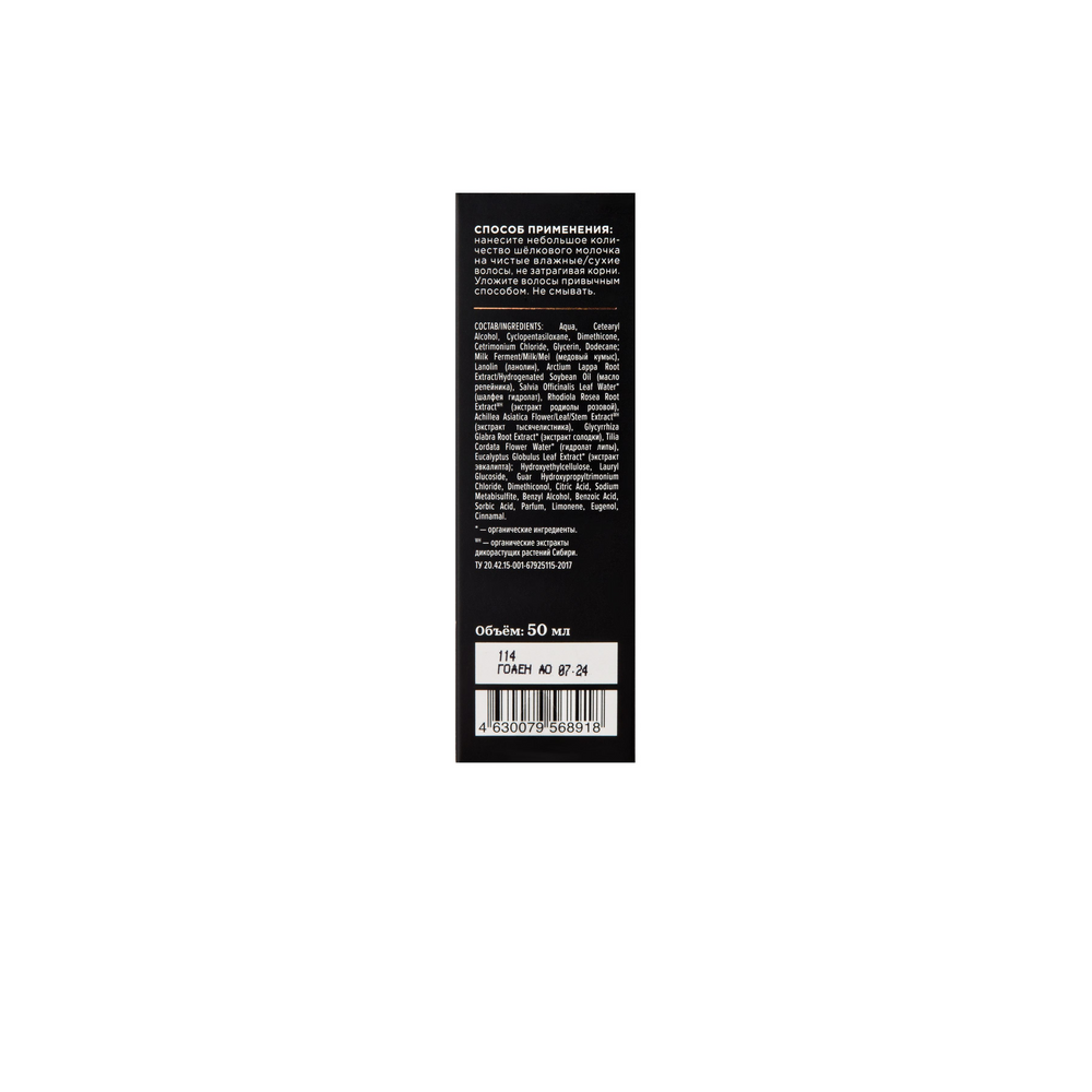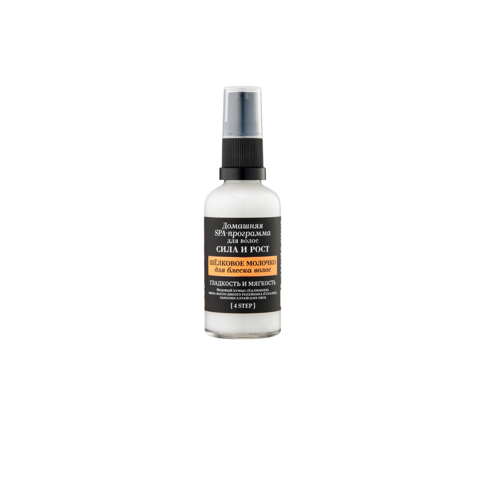 Несмываемое шёлковое молочко обеспечивает дополнительное питание и придаёт волосам роскошный блеск. Медовый кумыс, богатый жирными кислотами и витаминами А, группы В и РР, возрождает повреждённые волосы. Омега-масло дикого репейника питает и придаёт эластичность волосам, предотвращая ломкость. Натуральный ланолин обволакивает каждый волос, создавая эффект ламинирования. Благодаря способности удерживать влагу, ланолин отлично увлажняет волосы изнутри, разглаживая их.
