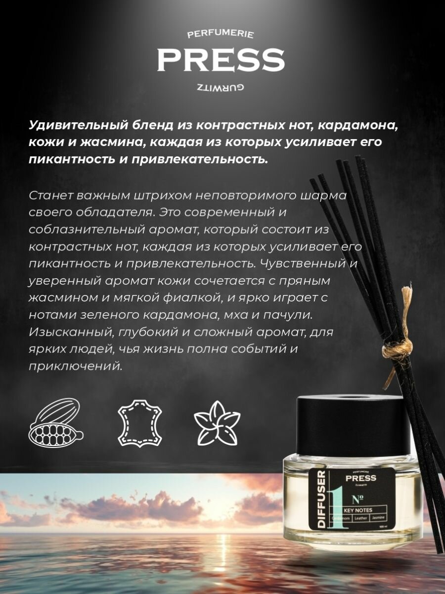 Диффузор ароматический для дома PRESS GURWITZ PERFUMERIE - это многогранный аромат в стеклянном флаконе, который впишется в любой интерьер и создаст в нем особую атмосферу. Чувственная и волнующая композиция с нотами ветивера, орхидеи и грейпфрута подарит Вам тепло, уют и незабываемую атмосферу в доме. Просто откройте флакон и опустите палочки в ароматический диффузор для дома. Сделанные из натурального ротанга, они быстро наполнятся жидкостью и будут отдавать аромат медленно и равномерно, поэтому вы сможете наслаждаться им до 30 дней. Регулировать интенсивность ароматизатора для дома можно добавлением или уменьшением количества палочек. А если аромат станет менее ощутим, достаточно перевернуть палочки во флаконе. Попробуйте и другие ароматы для дома от PRESS GURWITZ PERFUMERIE. Идеальный подарок на 8 марта.