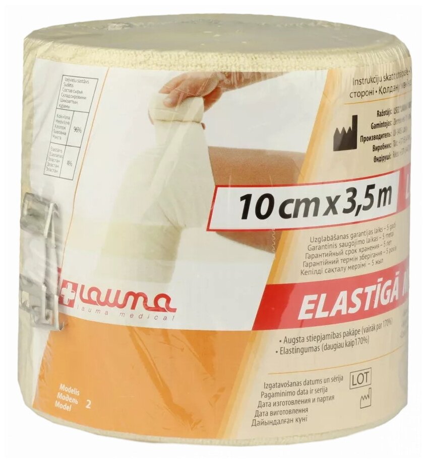 Эластичный медицинский бинт высокой степени растяжимости (более 170 %)Эластичный медицинский бинт высокой степени растяжимости применяется для профилактики и лечения хронических венозных воспалительных процессов в до- и послеоперационный периоды, для профилактики образования гематом и удержания эндопротезов в стабильном состоянии при пластических операциях, а также для профилактики и лечения травм, связанных со спортом.Специальная технология ткачества, применяемая при производстве бинта, обеспечивает отличное качество и сохранение свойств даже при длительном и интенсивном использовании. Металлический фиксатор позволяет удерживать бинт в нужном месте, быстро и легко накладывается без перекручивания бинта, надёжно закрепляется и не сползает