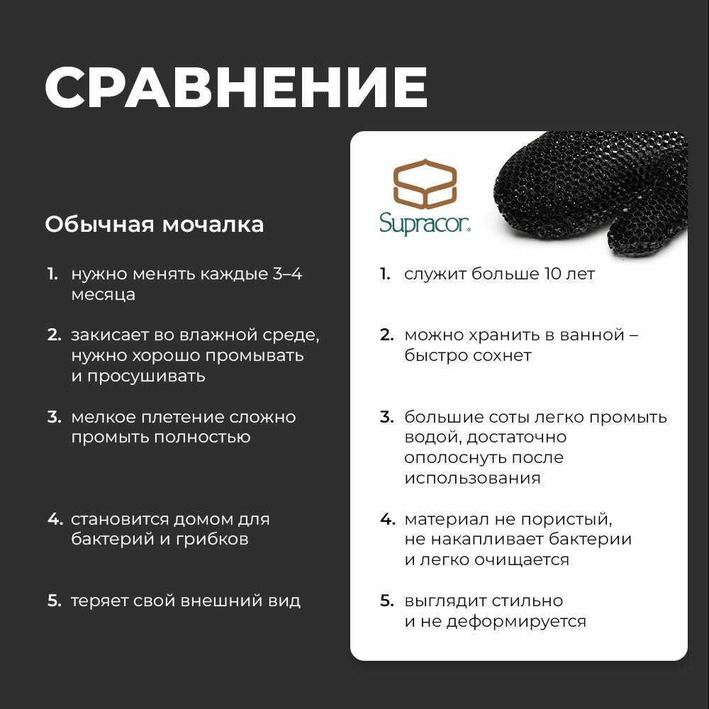 Рукавичка базовой жёсткости (уровень 2 из 4, обе стороны одинаковые). Это универсальный аксессуар для ежедневного купания, пилинга, антицеллюлитного массажа и сухого лимфодренажа. Создана в Калифорнии по запатентованной технологии пчелиных сот, которые растягиваются в любом направлении и легко промываются. Ячейки состоят из современного термопластичного эластомера и соединены плавлением (без клея). Сочетание инновационного материала и технологии Honey comb позволяет мочалке служить более 10 лет, не деформируясь, не закисая и не накапливая бактерии. Текстура создаёт пенную шапку из горошины геля, это экономит вашу косметику. Рукавичка быстро сохнет: пропускает всю воду и воздух. Гипоаллергенная. Не тестируется на животных. Идеальна для подготовки к эпиляции и загару. Заменяет сразу все скрабы, мочалки и массажные щётки.Просто смочите рукавичку, нанесите на неё немного мыла или геля, вспеньте и получайте удовольствие от купания. Либо массируйте тело по маслу или вообще без всего. После массажа такой рукавичкой любые кремы и сыворотки впитываются ещё лучше. При регулярном использовании она делает тело упругим, сглаживает растяжки и бугорки, смягчает и омолаживает кожу. Вы заметите эффект уже через пару недель.