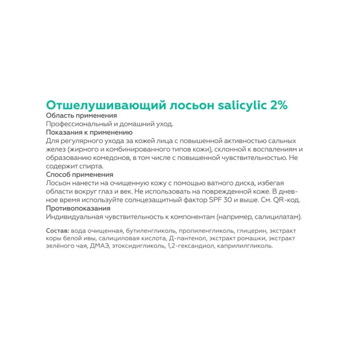 Отшелушивающий лосьон с салициловой кислотой незаменим для ухода за кожей лица с повышенной активностью сальных желез, склонной к воспалениям и комедонам. Также отлично подходит для себорейных зон тела (спины, груди, плечей). Лосьон работает сразу в нескольких направлениях: отшелушивает ороговевшие клетки эпидермиса предотвращает образование комедонов уменьшает воспалительные процессы и жирный блеск способствует очищению и сужению пор сокращает количество черных точек выравнивает тон, придает гладкость и сияние коже Средство не нужно смывать, при этом оно очень комфортно ощущается на лице. В составе нет спирта, поэтому лосьон не сушит и не стягивает кожу. Подходит для домашнего и профессионального ухода. При использовании лосьона в дневное время дополните его средством с солнцезащитным фактором SPF 30 и выше. А также не наносите его на поврежденную кожу лица.